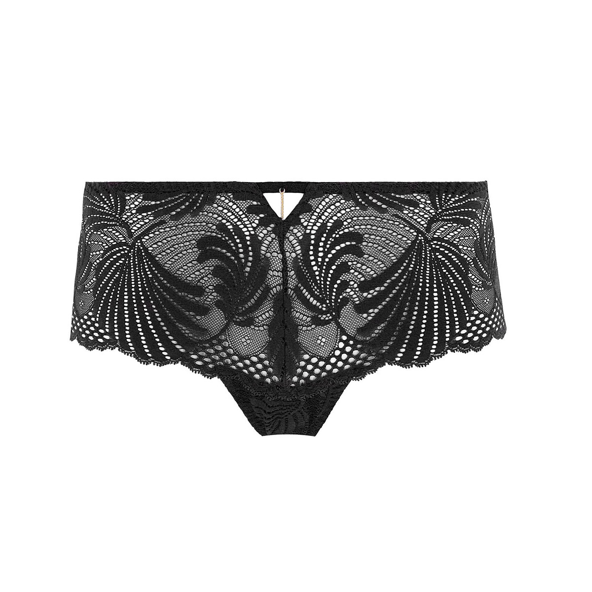 Трусы - боксеры со средне-заниженной посадкой. Выполнены из жаккардового кружева, сделанного во Франции. Бесшовные нижние края - для маскимальной невидимости под одеждой. Передняя панель дополнена декоративной золотой спиралью, задняя - декоративной шнуровкой.