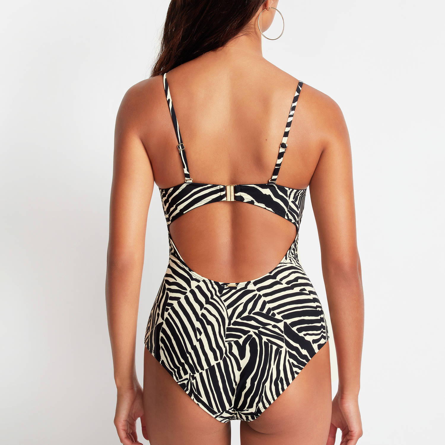 Цельный купальник с уплотненными чашками в форме бандо, с прослойкой из мусса, на косточках. Передняя и задняя панели дублированы для избежания прозрачности. Отстегивающиеся бретели регулируются. Полностью выполнен из мягкой, эластичной и гладкой микрофибры с набивным рисунком. Застежка - золотая клипса с логотипом.