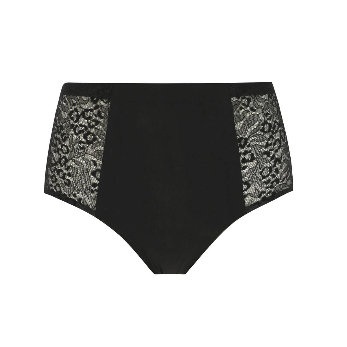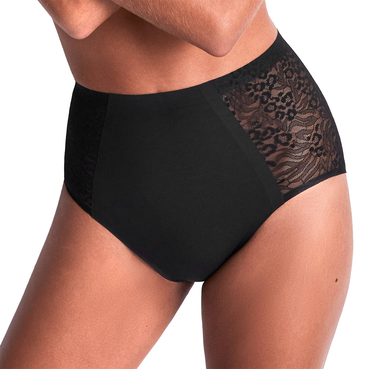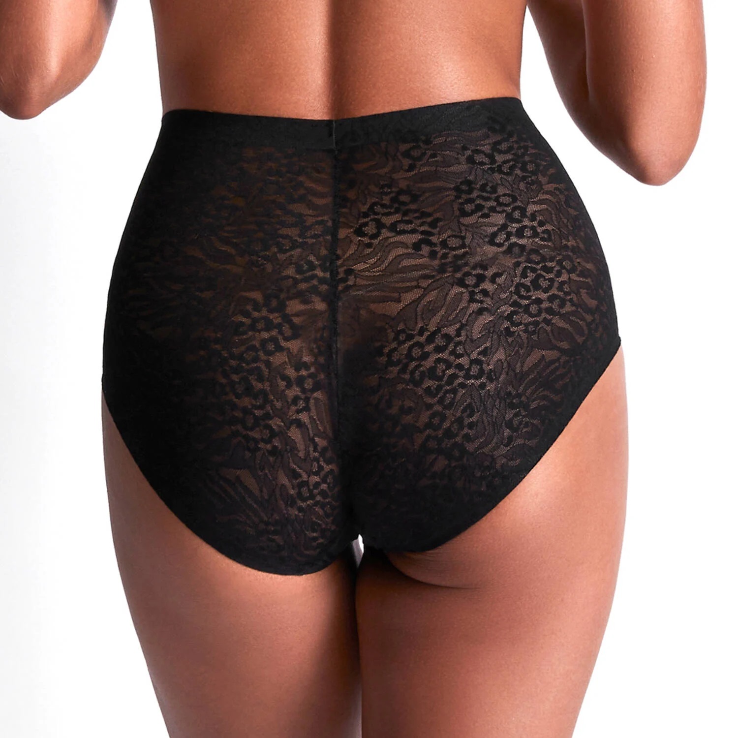 Трусы с высокой талией с высокой посадкой. Передняя панель выполнена из гладкой микрофибры, с внутренней стороны дублирована плотным тюлем для эффекта коррекции. Боковые и задняя панели выполнены из жаккардового эластичного кружева. Все края изделия - "запаянные", что позволяет быть максимально незаметными под одеждой.