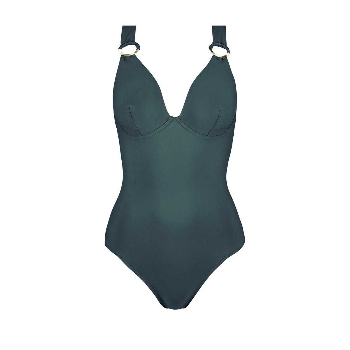 Цельный купальник с мягкой треугольной формой чашек на косточках. Чашки бюстгальтера, а также передняя и задняя панели дублированы. Эластичные регулирующиеся бретели соединяются с чашками при помощи декоративных золотых колец. Застежка - золотая клипса с логотипом.