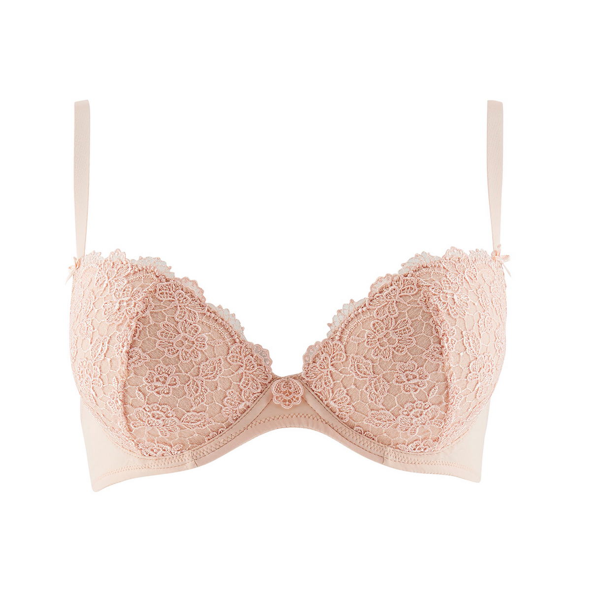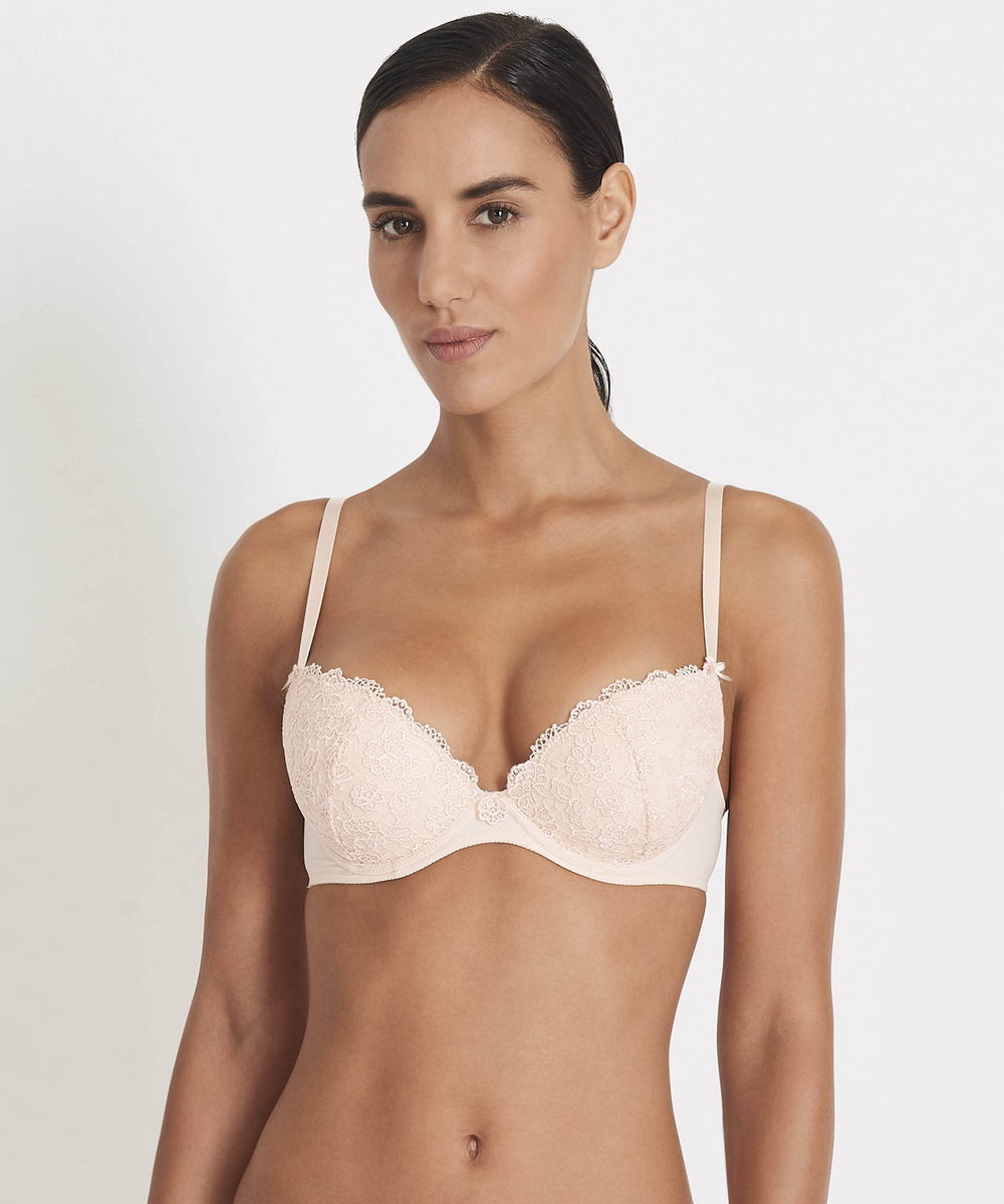 Бюстгальтер пуш ап с плотной формой чашек, которые выполнены из мусса . Чашки полностью покрыты невероятно "нежным" гипюром жемчужного цвета, который деликатно оттенен золотой нитью, благодаря которой создается эффект тату. Область декольте дополнена декоративными зубчиками. Основания бретелей украшены маленькими бантиками. Глубокое и обольстительное декольте Вам гарантировано! Регулирующиеся бретели.