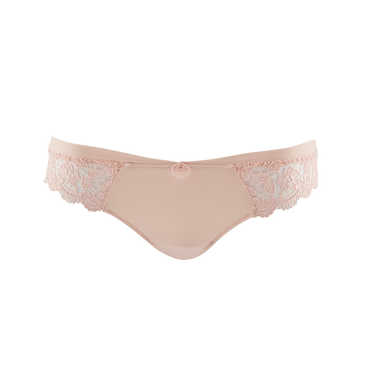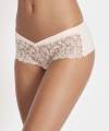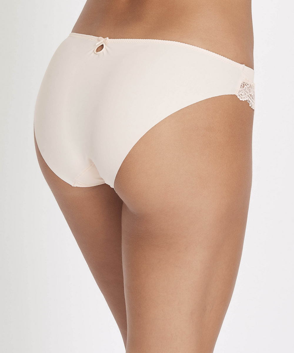 Трусы классические со средней посадкой. Практически полностью выполнены из микрофибры. Симметричные вставки из "жемчужного" гипюра на боковых панелях придают нежность и женственность изделию. Задняя панель с необработанными краями, чтобы обеспечить максимальную невидимость под одеждой. Посредине - "слезка", украшенная вверху бантиком.