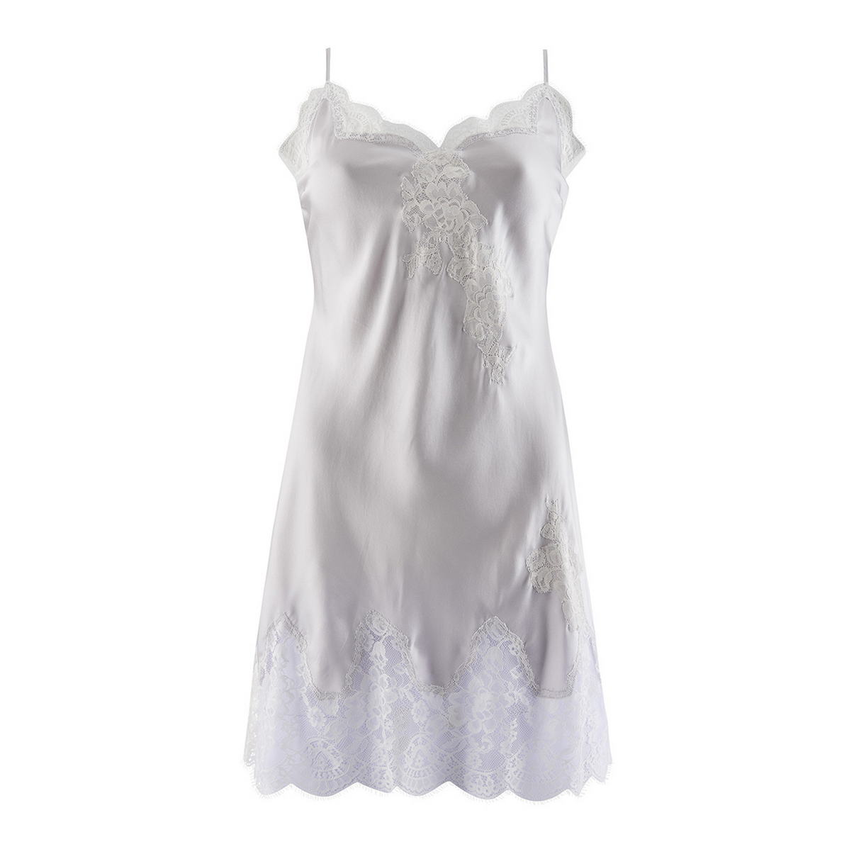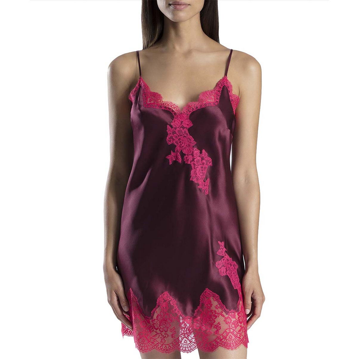 Легкая струящаяся комбинация на тонких бретелях с более глубоким V-образным вырезом декольте, которое декорировано (как и нижний край) кружевом. Регулирующиеся бретели.