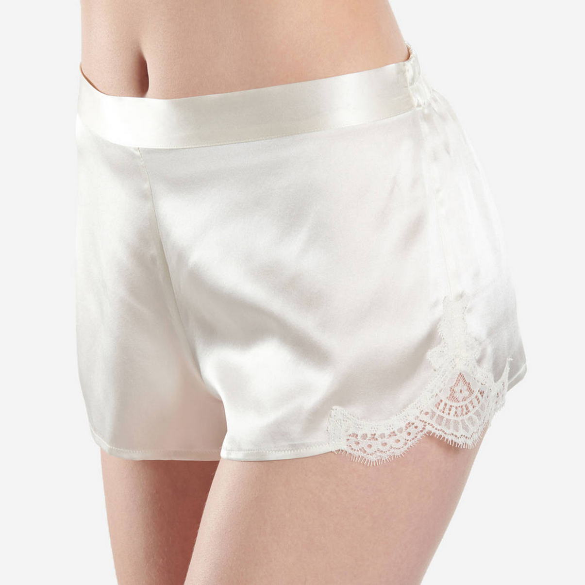 Секси - шорты, боковые панели которых декорированы кружевом. Пояс: плоский и не эластичный спереди, присобран и эластичен - на задней панели - благодаря вставленной внутрь резинке.