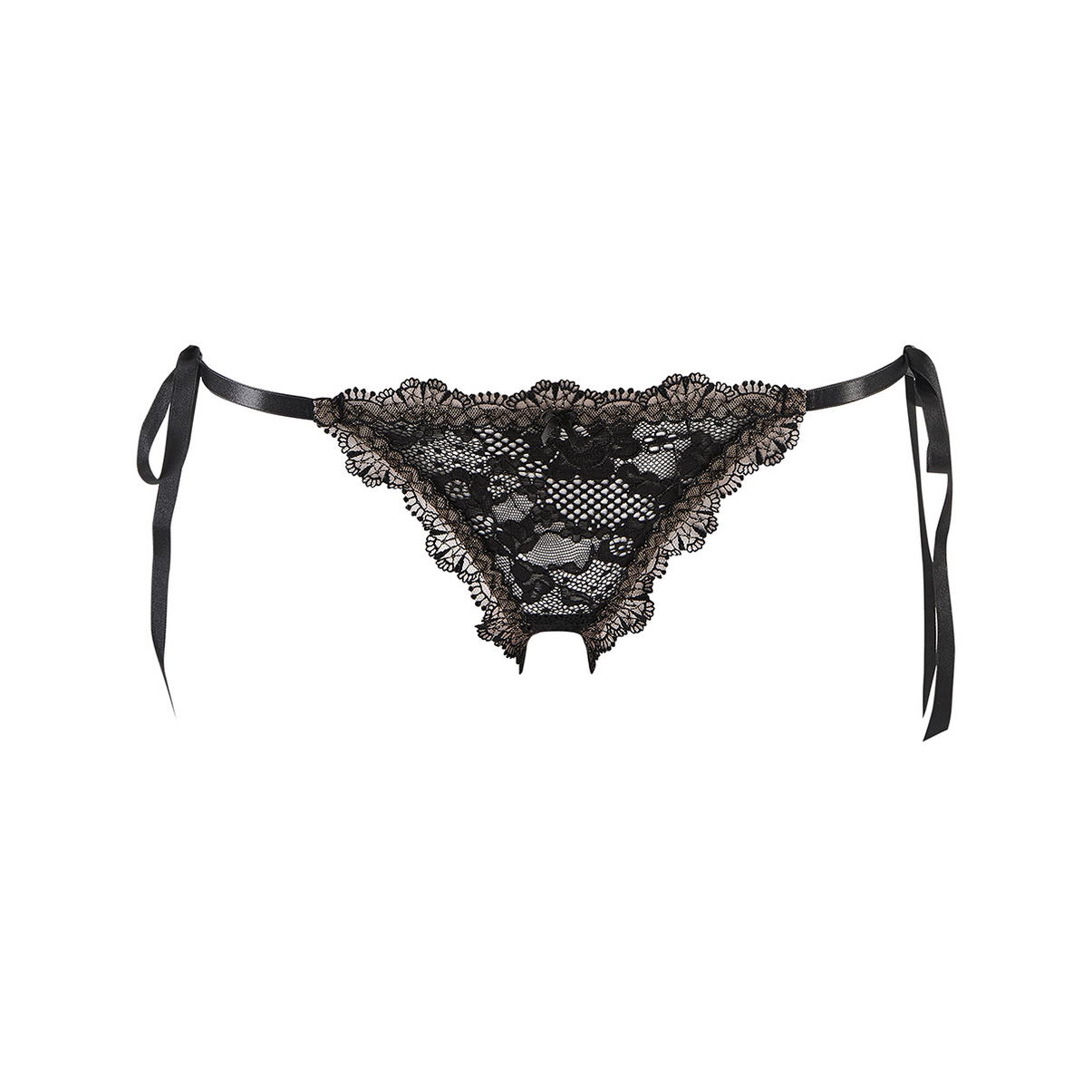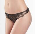 Трусы-бикини с низкой посадкой на завязках. Передняя и задняя панели выполнены из тюля, который декорирован цветочной вышивкой. Задняя панель дополнена шнуровкой.