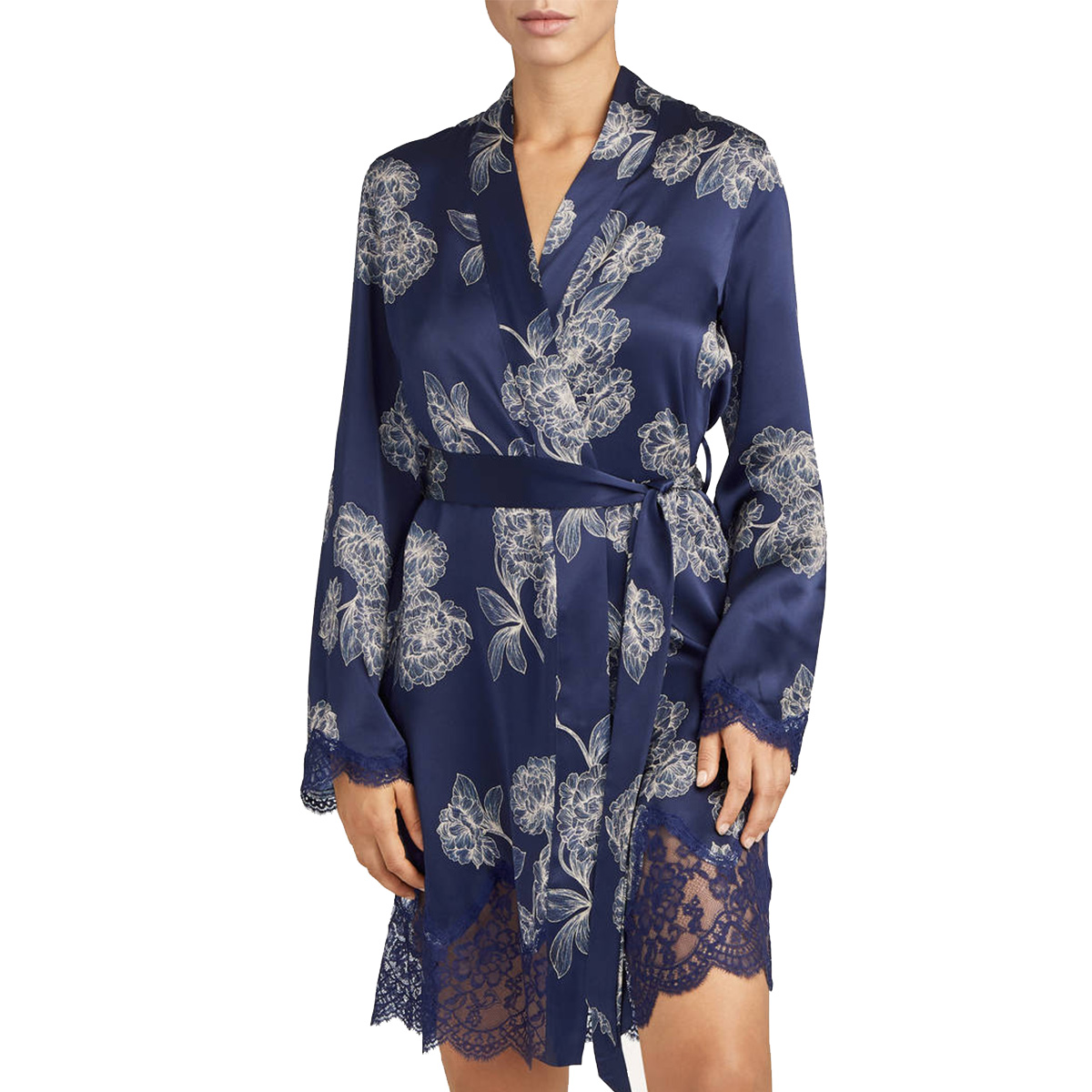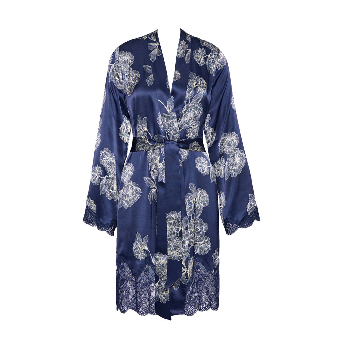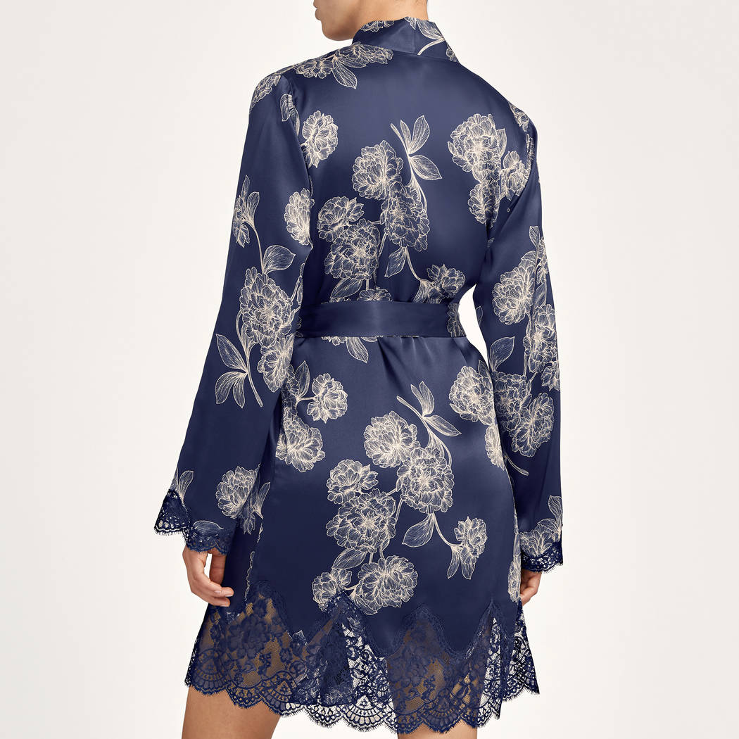 Халат свободного кроя, с поясом, выполнен из шелка. Манжеты рукавов и нижний край декорированы кружевом.