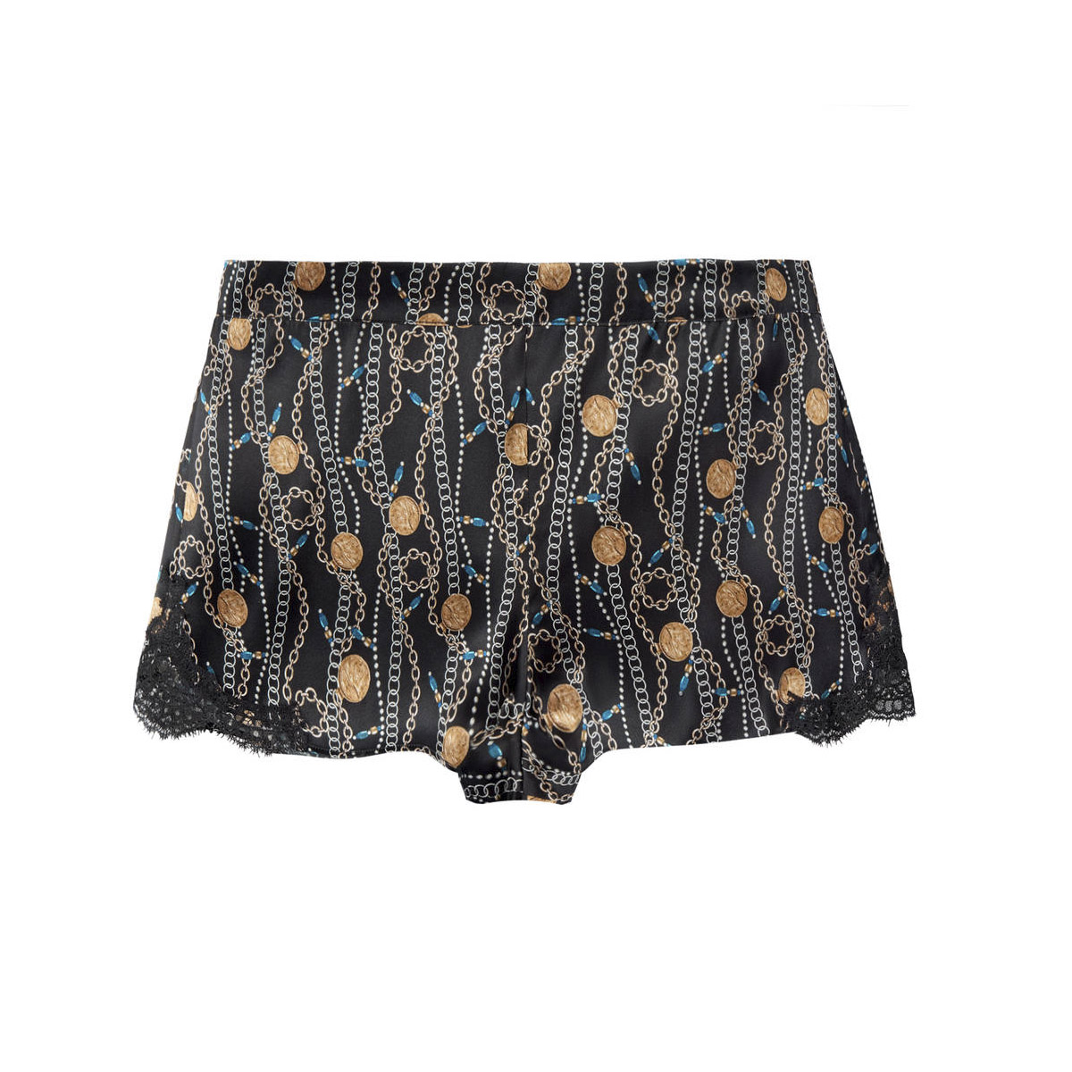 Секси - шорты свободного кроя, боковые панели которых декорированы кружевом, выполнены из нежнейшего шелка. Пояс: плоский и не эластичный спереди, присобран и эластичен - на задней панели - благодаря вставленной внутрь резинке.