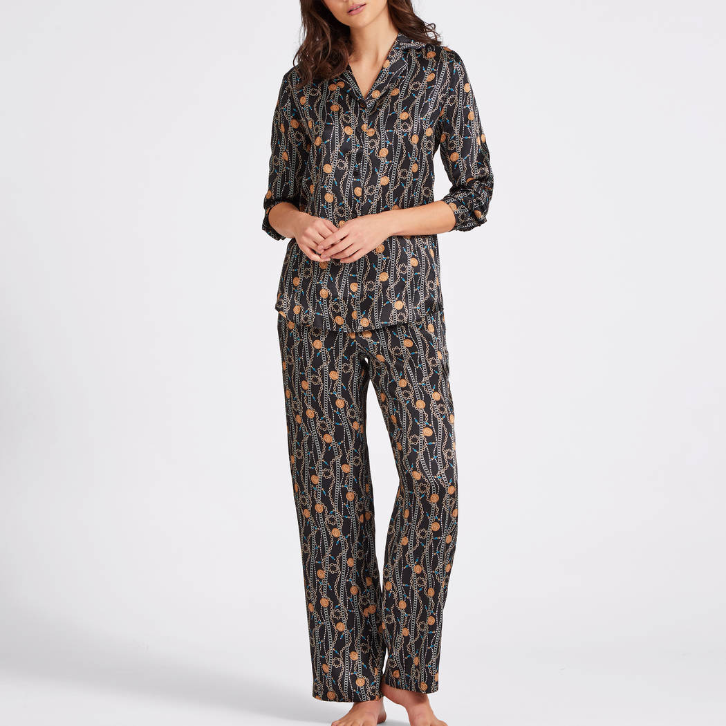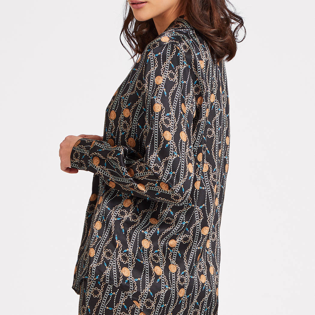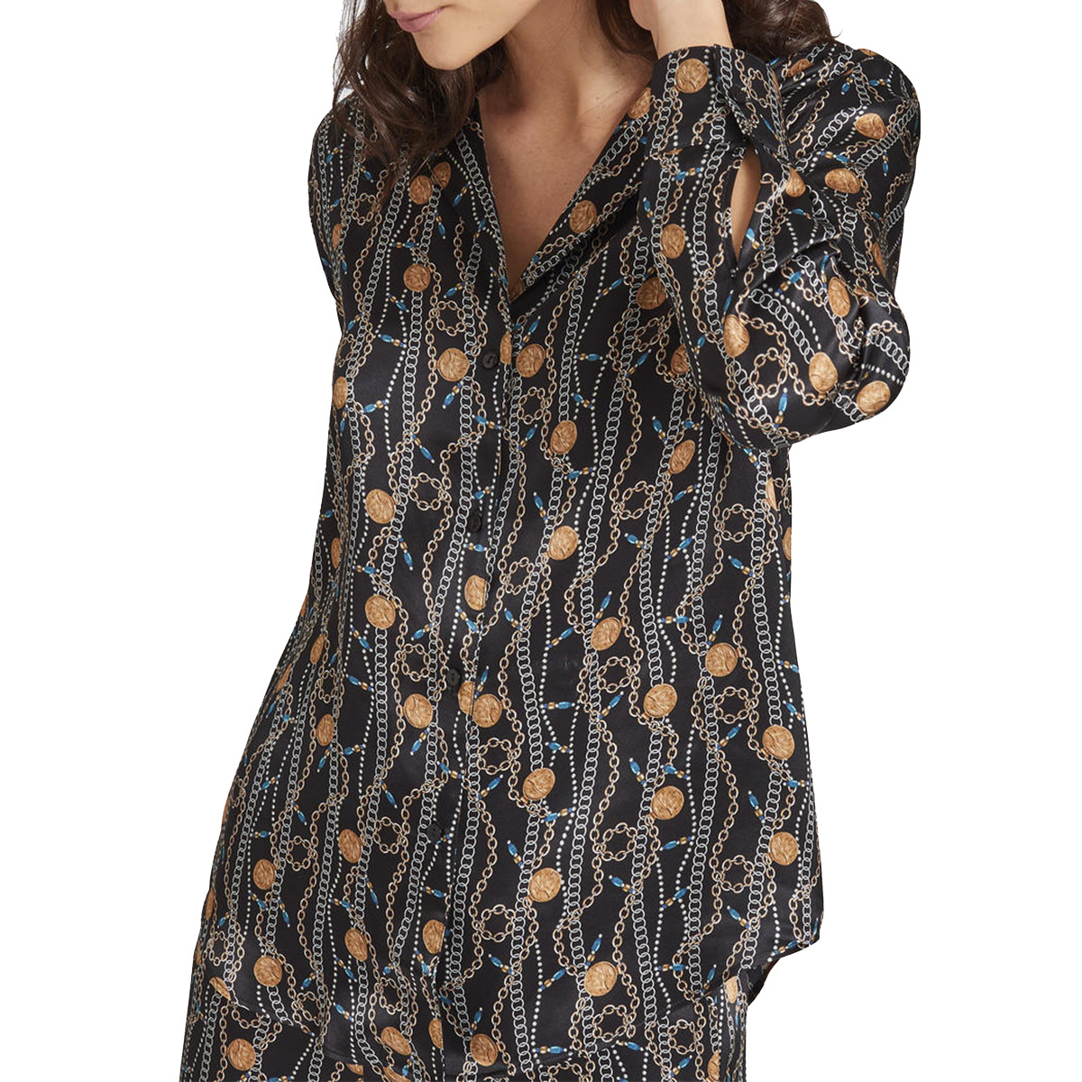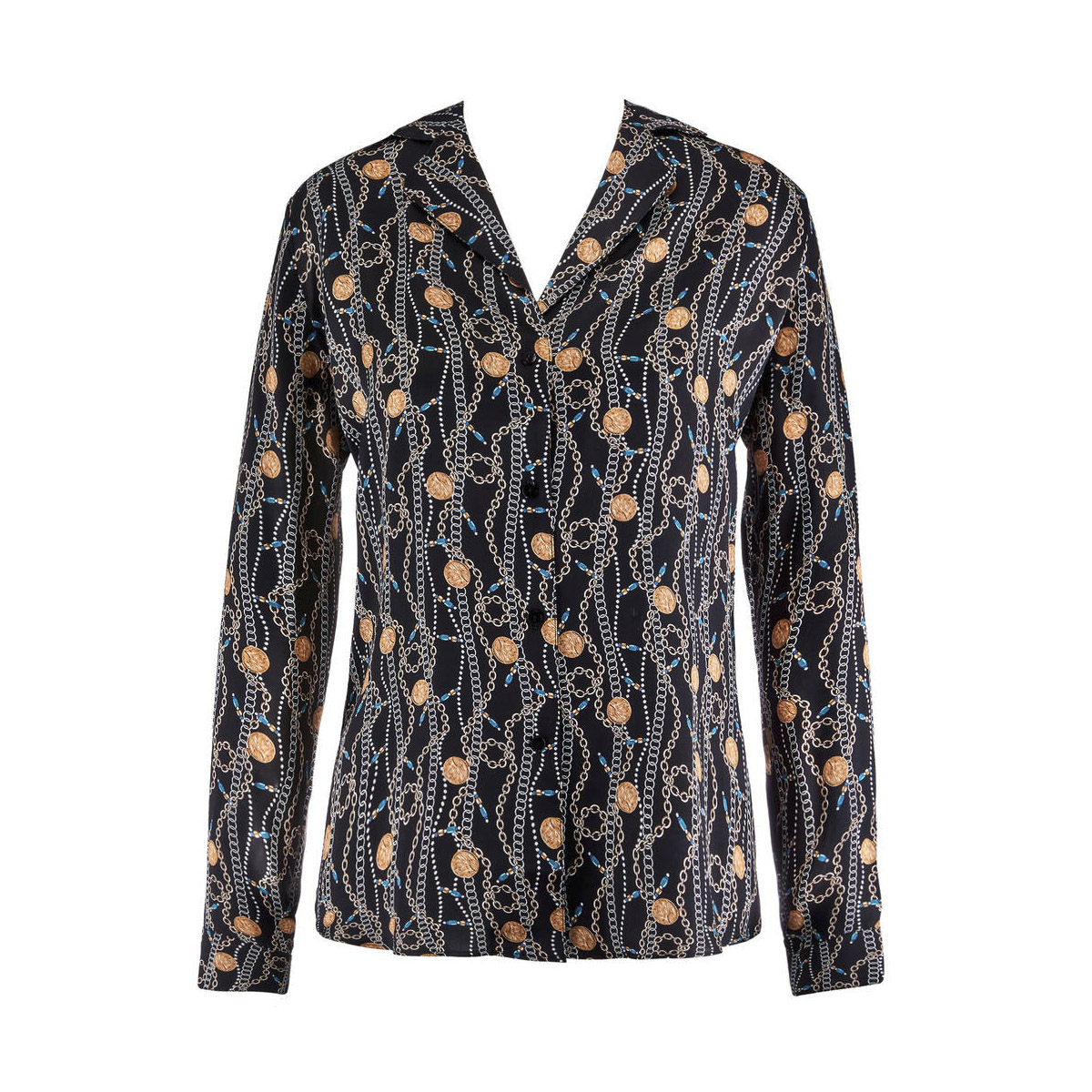 Рубашка свободного кроя на пуговицах с длинными рукавами с V-вырезом и воротничком. Полностью выполнена из шелка и требует особого ухода.