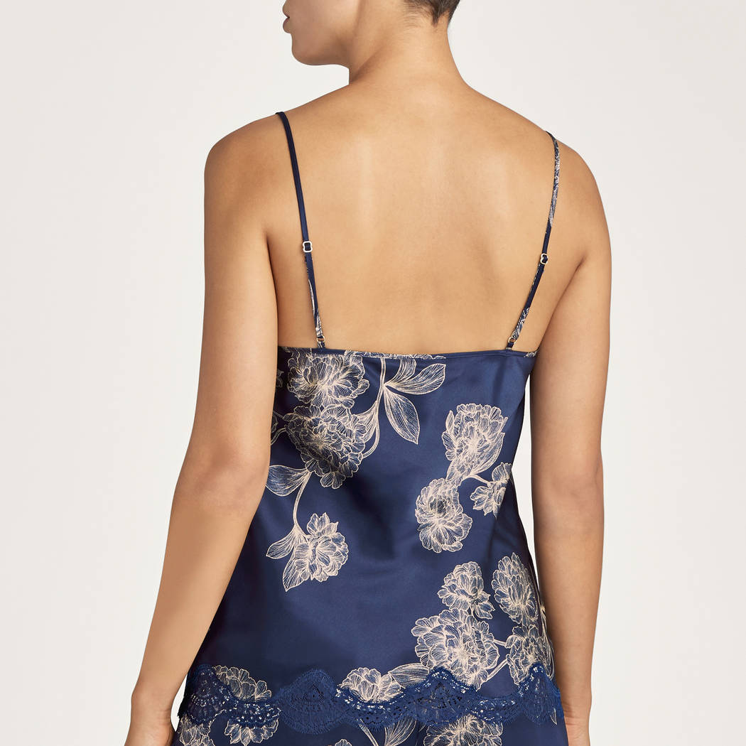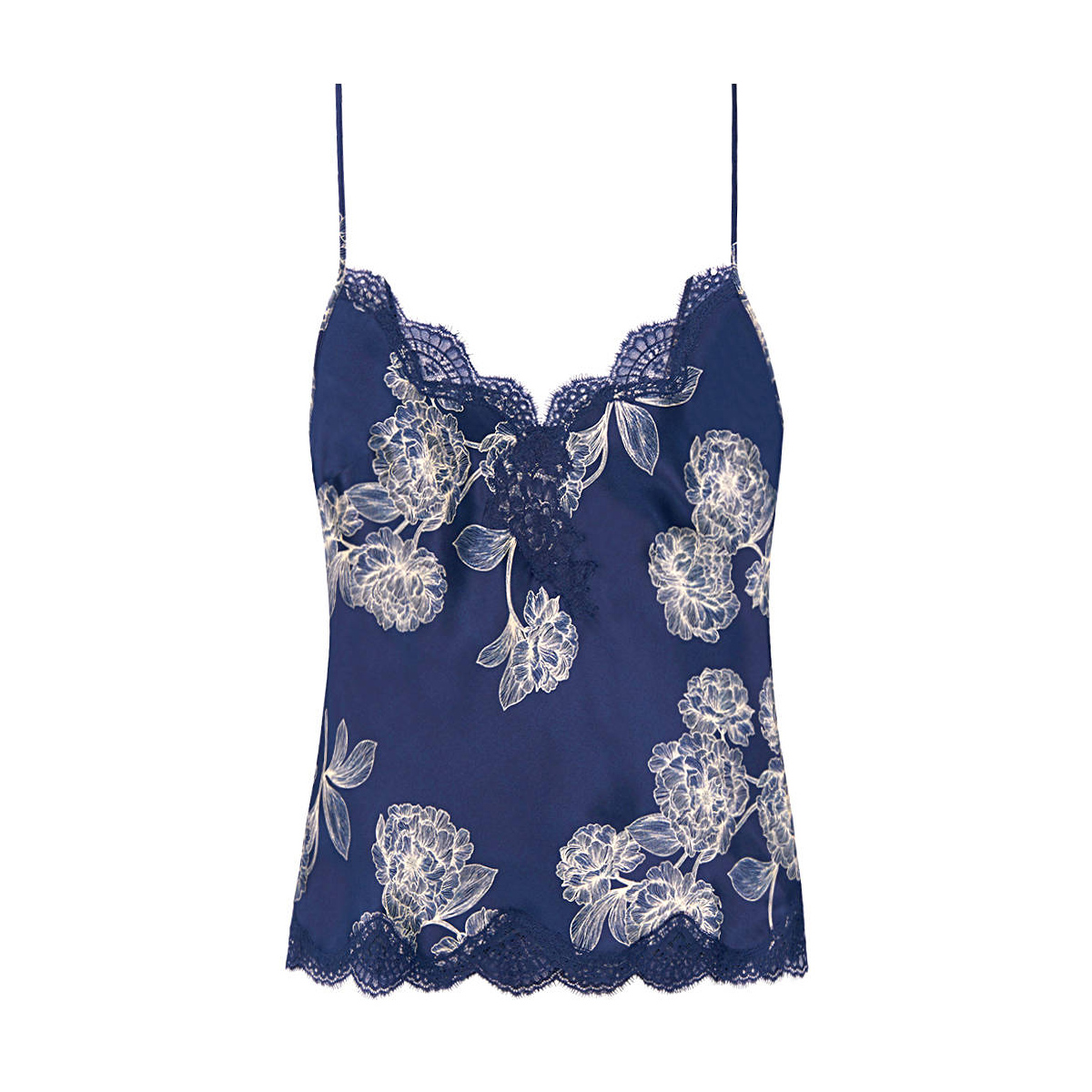 Майка свободного кроя, на тонких регулирующихся бретелях, с глубоким V-образным вырезом декольте, которое декорировано кружевом, выполнена из нежнейшего шелка. Нижний край также отделан кружевом.