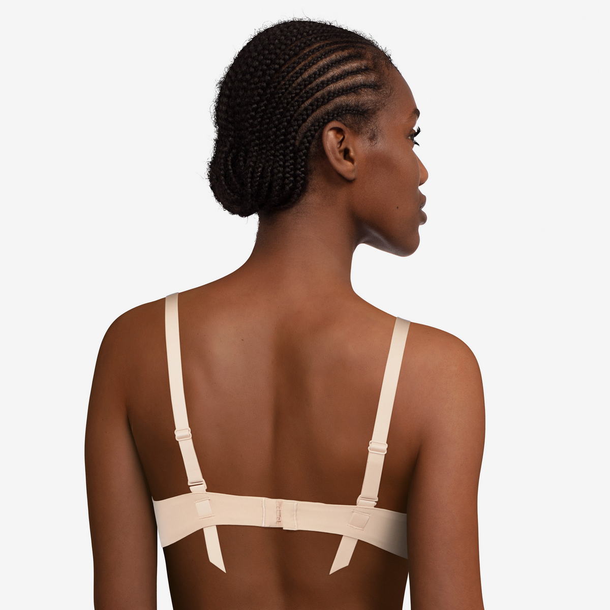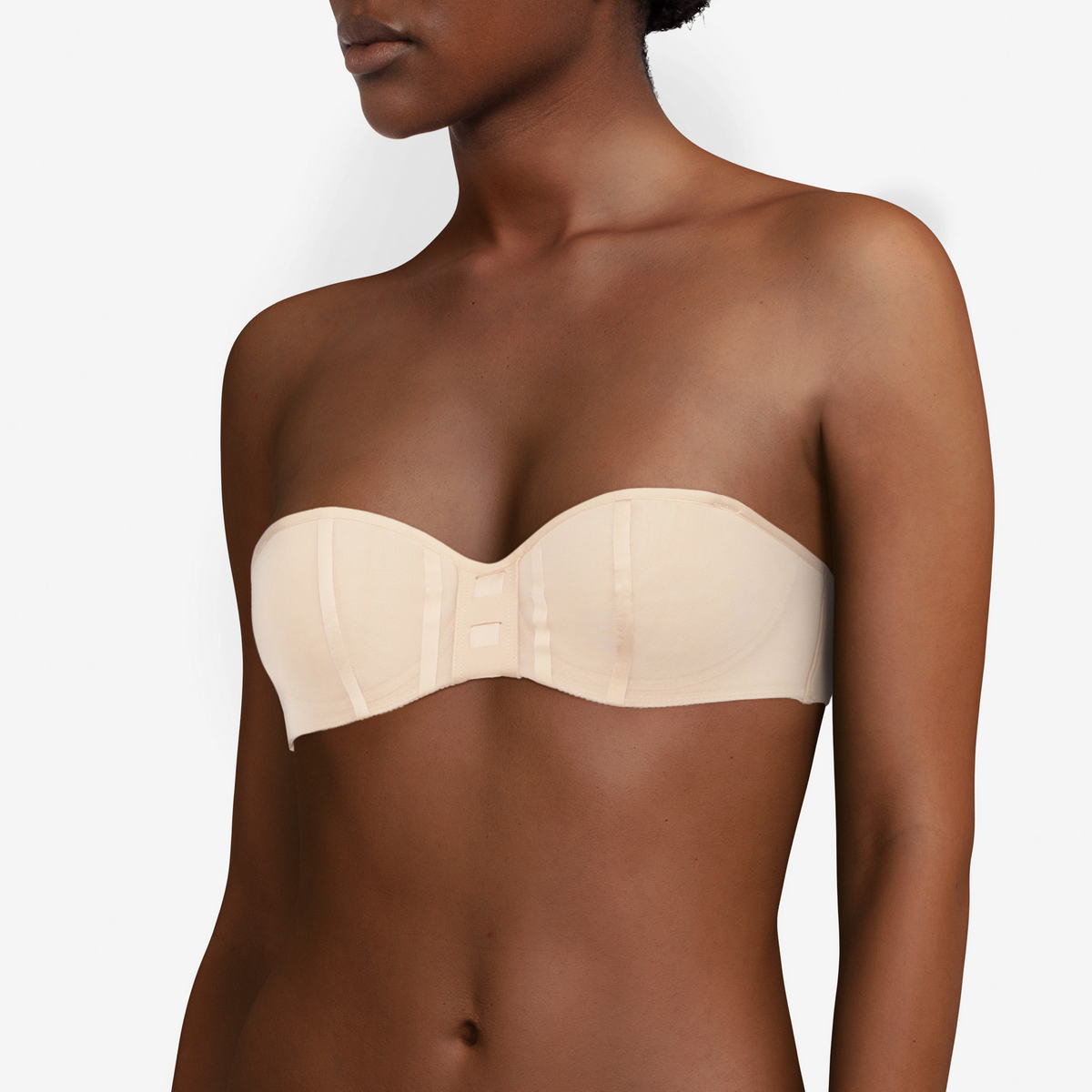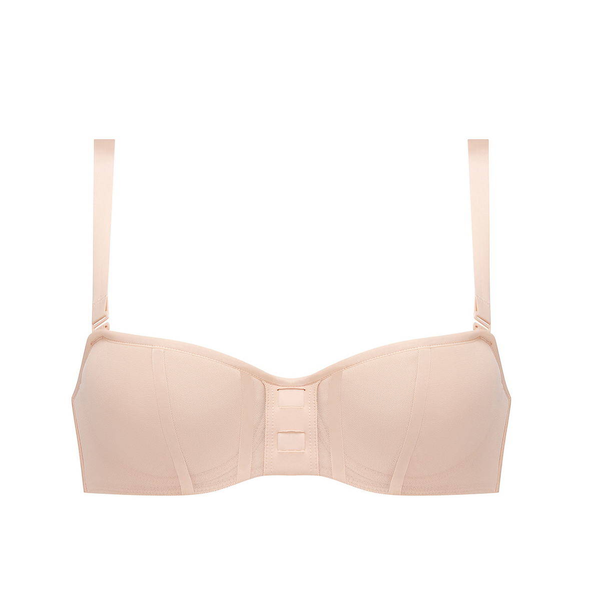 Бюстгальтер - бандо с интегрированными подушками, с отстегивающимися бретелями. Чашки бюстгальтера покрыты прозрачным тюлем с графичными полосками, центральная панель декорирована. Задняя панель - бесшовная.
