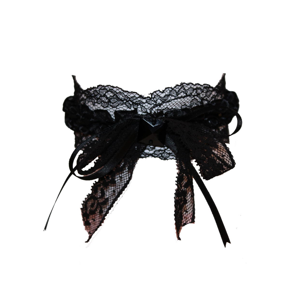 Кружевная основа украшения, декорированная атласной лентой в форме «фру-фру». В центре расположен бант из нежного кружева и тонкой черной атласной ленты, который зафиксирован черным камнем в форме кристалла. Колье фиксируется на шее за счет атласной черной ленты. Это яркое интересное украшение способно стать той самой изюминкой, в которой нуждается обычный повседневный наряд.