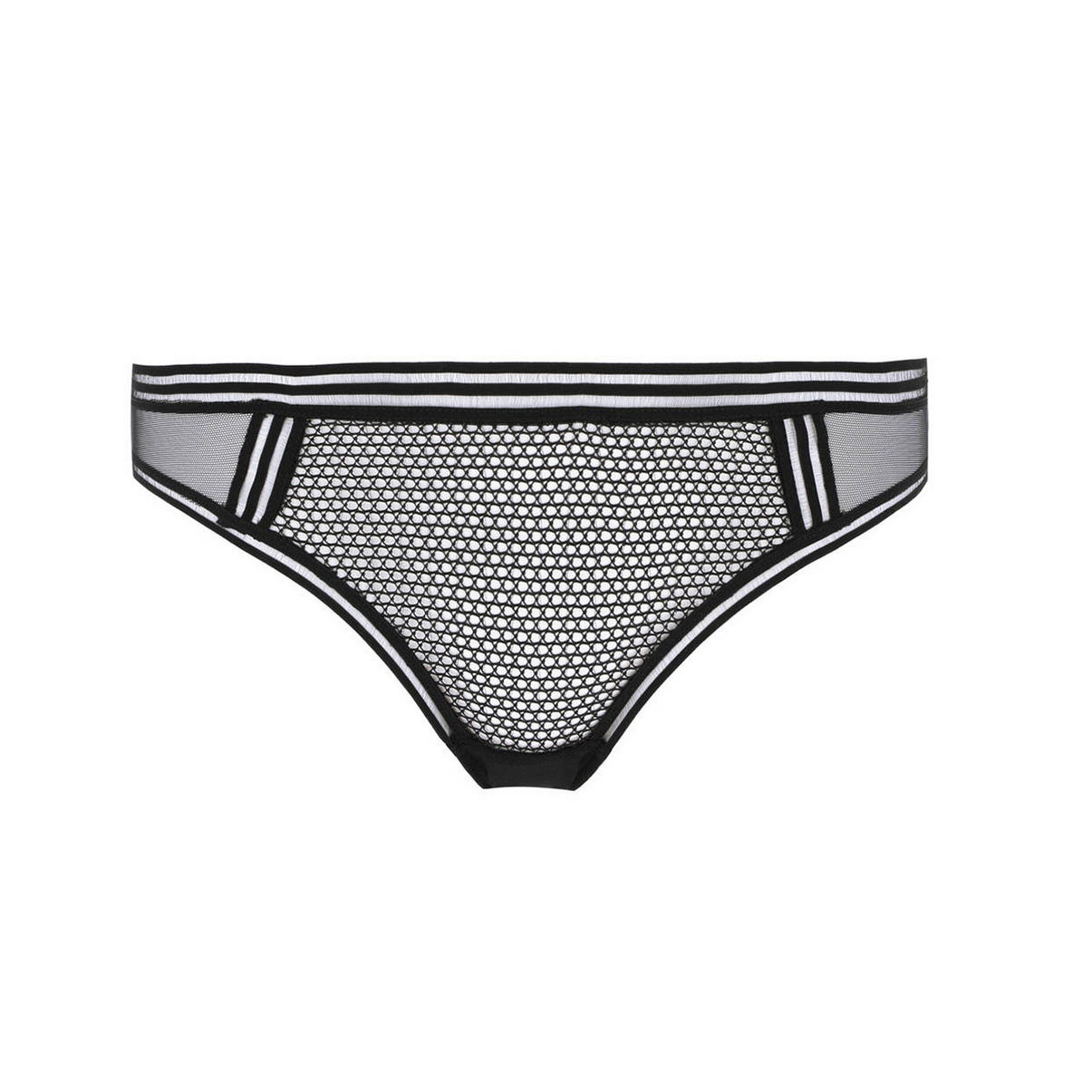 Трусы - классические со средне-заниженной посадкой. Передняя панель выполнена из сетки, задняя - из прозрачного тюля. Пояс декорирован "спортивными" полосками.