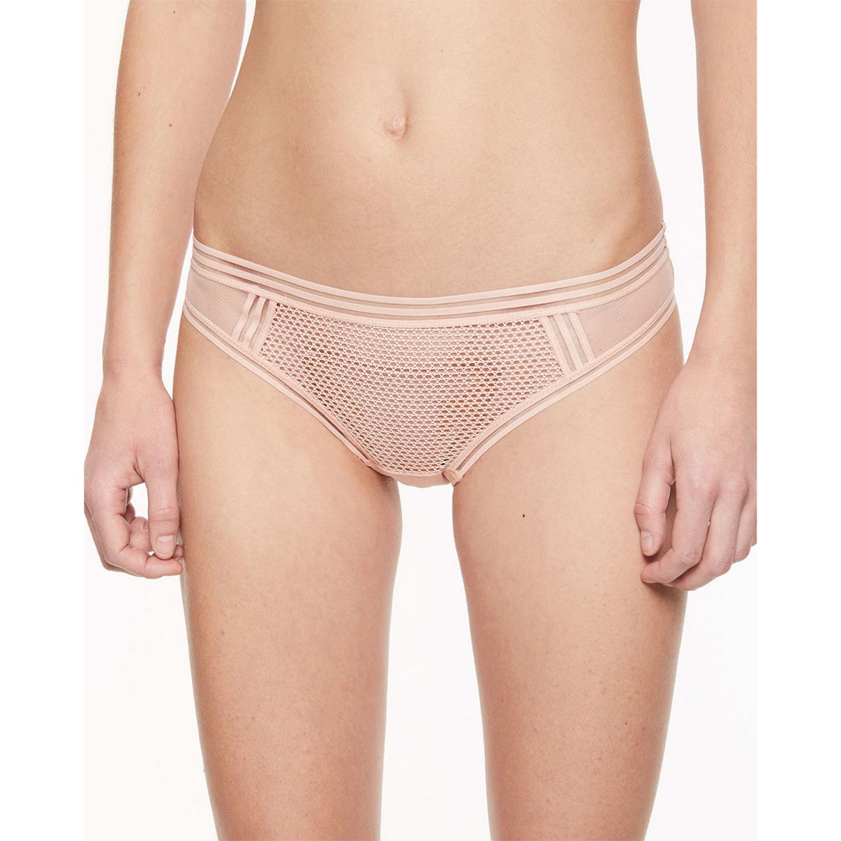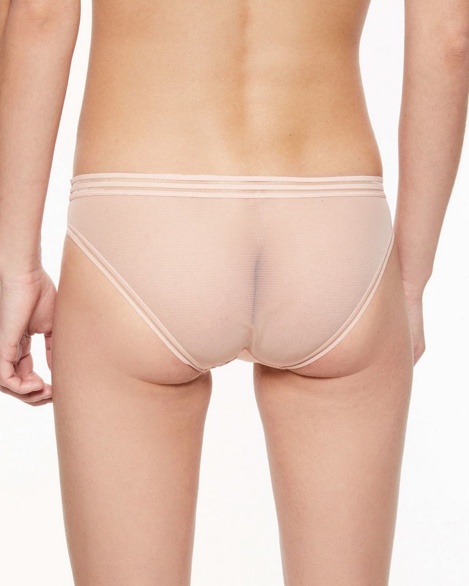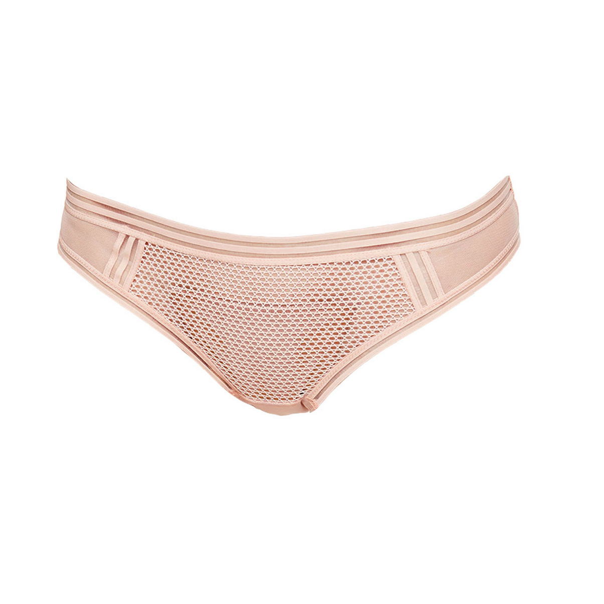 Трусы - классические со средне-заниженной посадкой. Передняя панель выполнена из сетки, задняя - из прозрачного тюля. Пояс декорирован "спортивными" полосками.