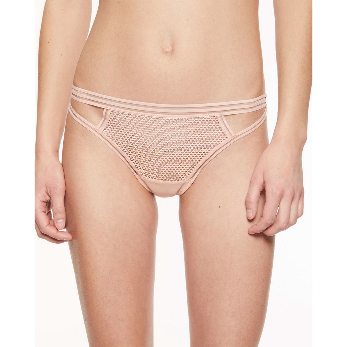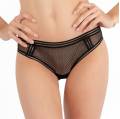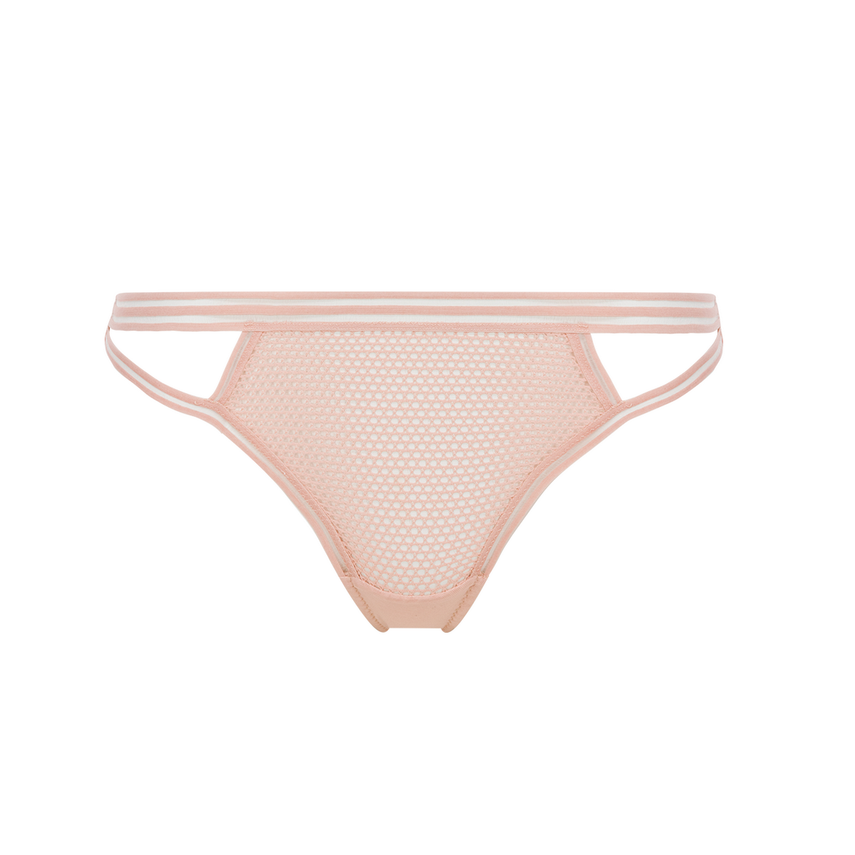 Трусы-стринги со средне-заниженной посадкой. Передняя панель выполнена из сетки, задняя - выполнена из прозрачного тюля и декорирована "спортивными" полосками. Пояс декорирован "спортивными" полосками, которые образуют треугольник.