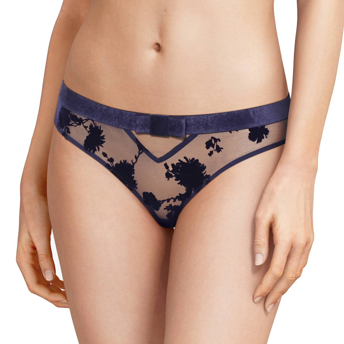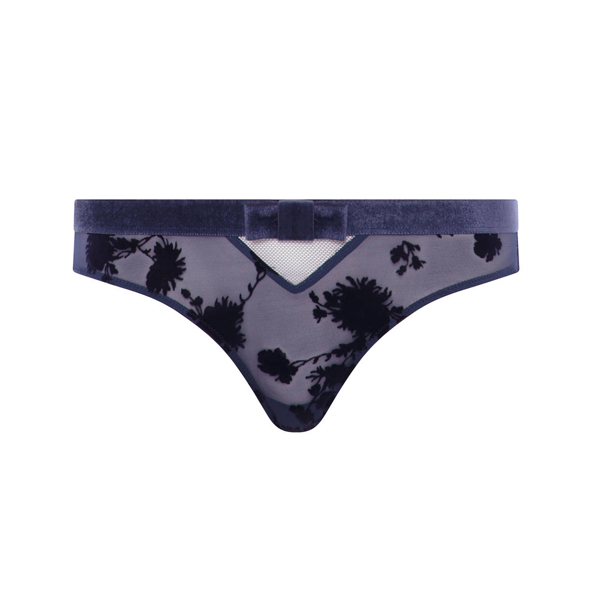 Трусики со среднезаниженной посадкой выполнены из прозрачнго тюля. Пояс из плотной полоски с изящным блеском и атласным бантом по центру. На передней панели маленький треугольничек по центру из сетчатой ткани, а сзади такой же треугольник чуть побольше и уже с двумя атласными бантиками.
