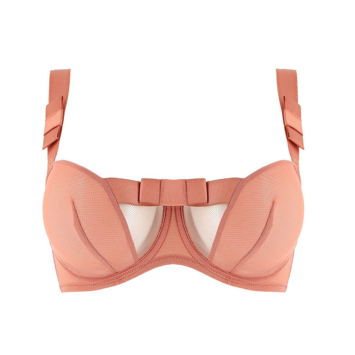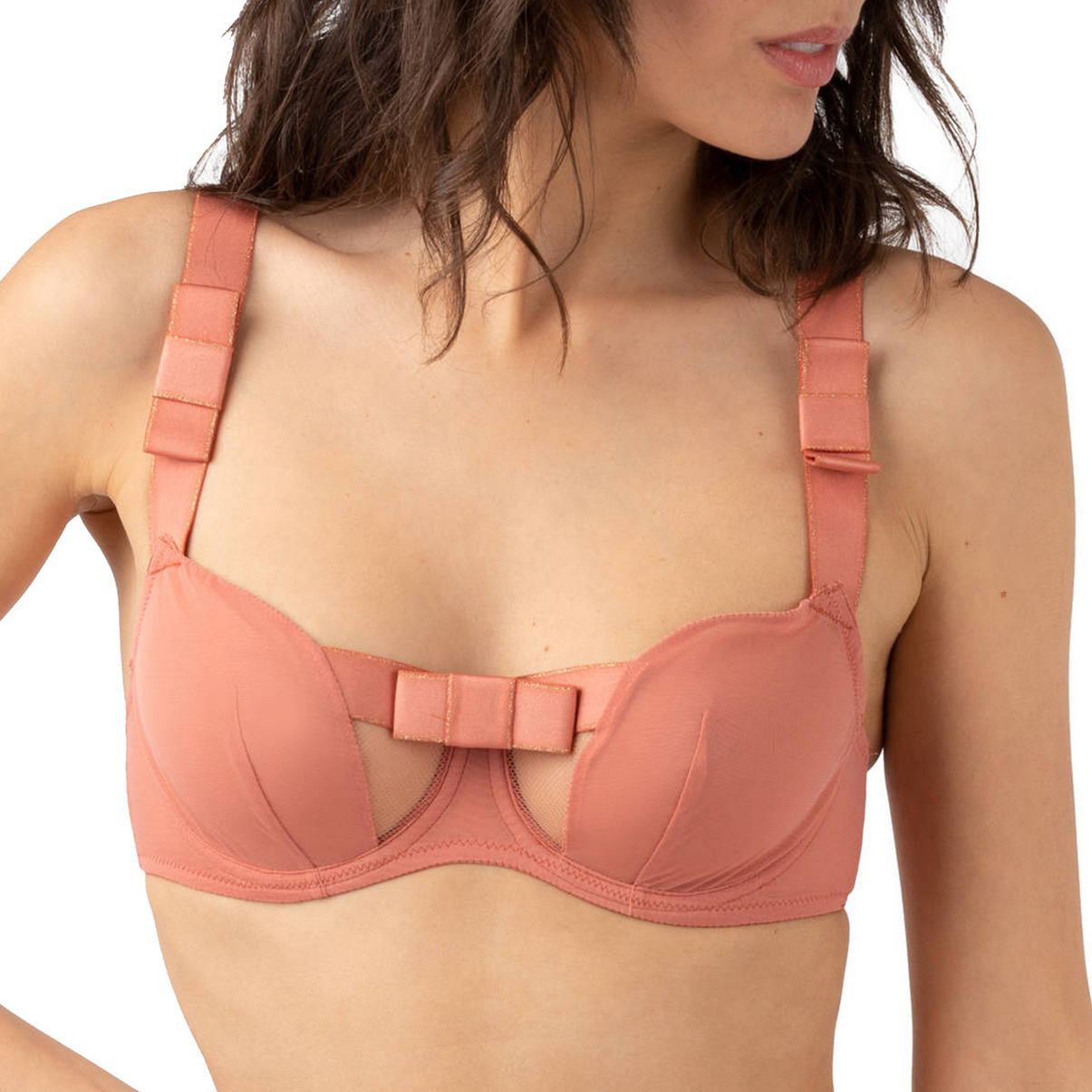 Мягкий бюстгальтер в форме балконет на косточках.Чашки выполнены из двойного прозрачного тюля с вертикальным швом. Дополнительная косточка на боковинах для лучшей посадки. Средняя часть из сетчатой ткани декорирована плотной полоской с изящным блеском и украшена атласным бантом по центру. Регулирующиеся бретели тоже из плотной полоски с изящным блеском, с логотипом "Chantal Thomass". На бретельках спереди также атласные банты