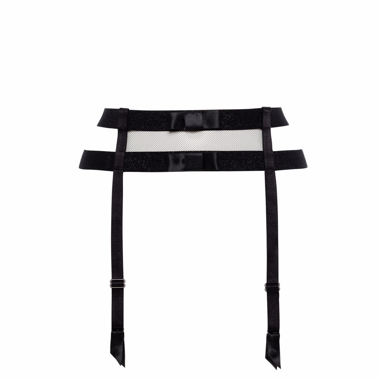 Очень изящный и сексуальный пояс для чулок из двух плотных полос с едва заметным блеском, которые спереди соединены сетчатой тканью и украшены атласными бантами по центру. По бокам - косточки для лучшей посадки.