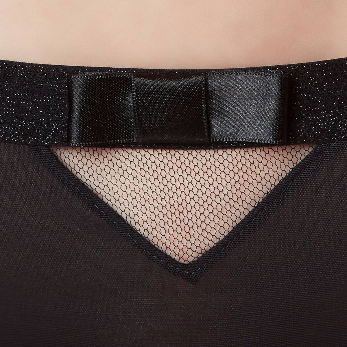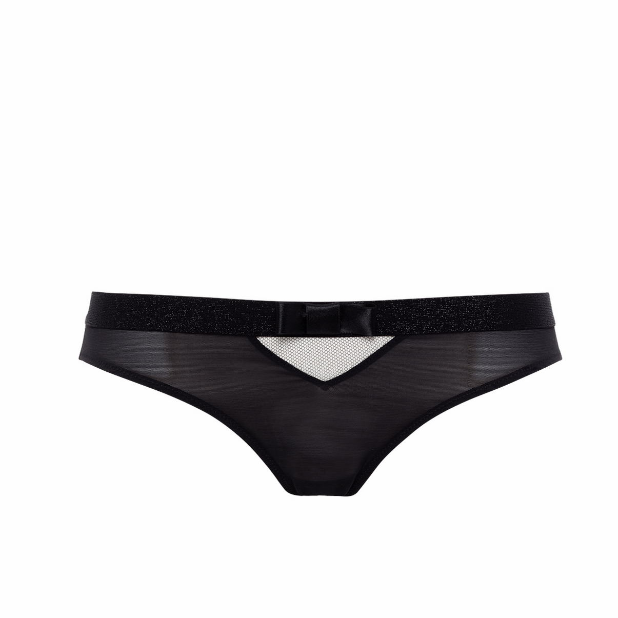 Трусики со среднезаниженной посадкой выполнены из прозрачнго тюля. Пояс из плотной полоски с изящным блеском и атласным бантом по центру. На передней панели маленький треугольничек по центру из сетчатой ткани, а сзади такой же треугольник чуть побольше и уже с двумя атласными бантиками.