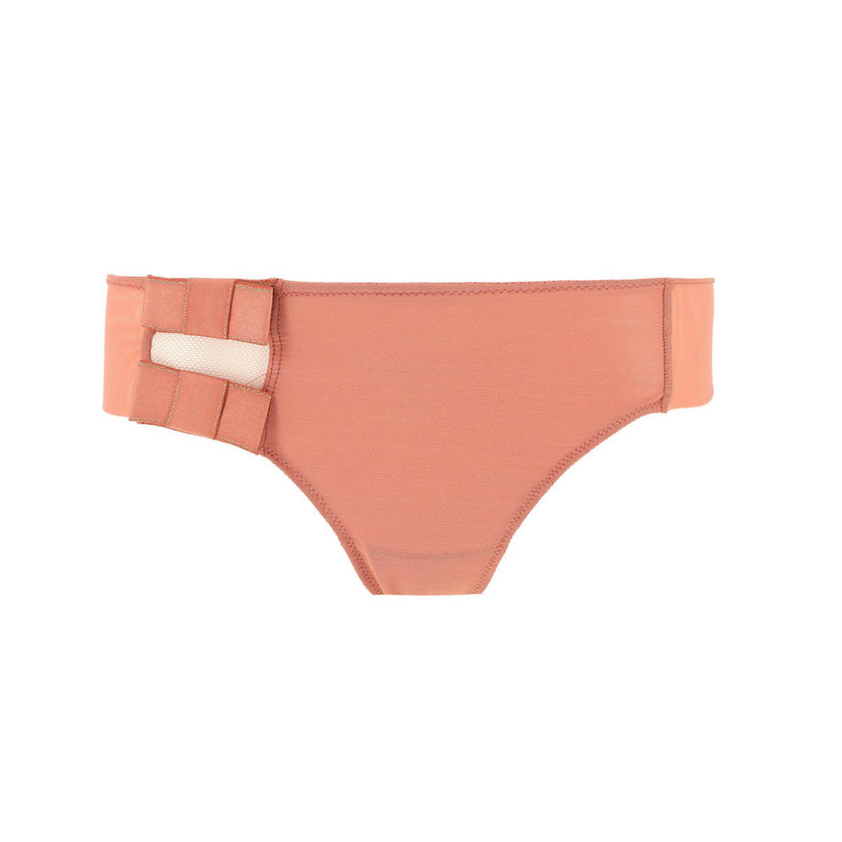 Трусики в форме боксеры-стринги с широким бедром со среднезаниженной посадкой выполнены из прозрачнго тюля. На передней панели справа вставка из сетчатой ткани с двумя атласными бантиками, а задняя панель с присобранным швом посредине - из двойного тюля, подвернутого снизу, что делает край абсолютно невидимым под одеждой и очень комфортным.
