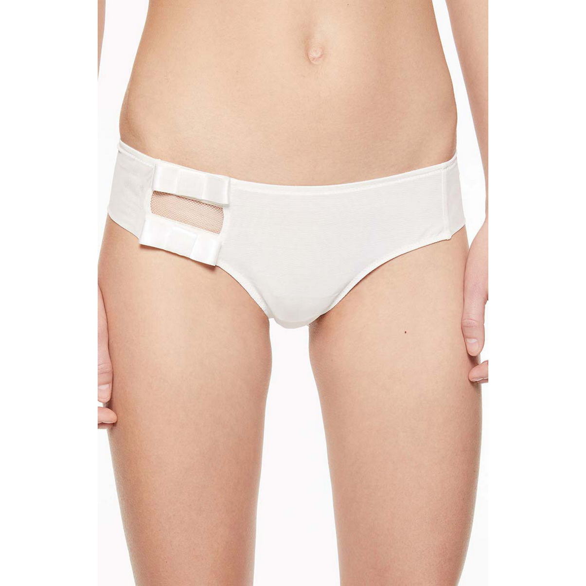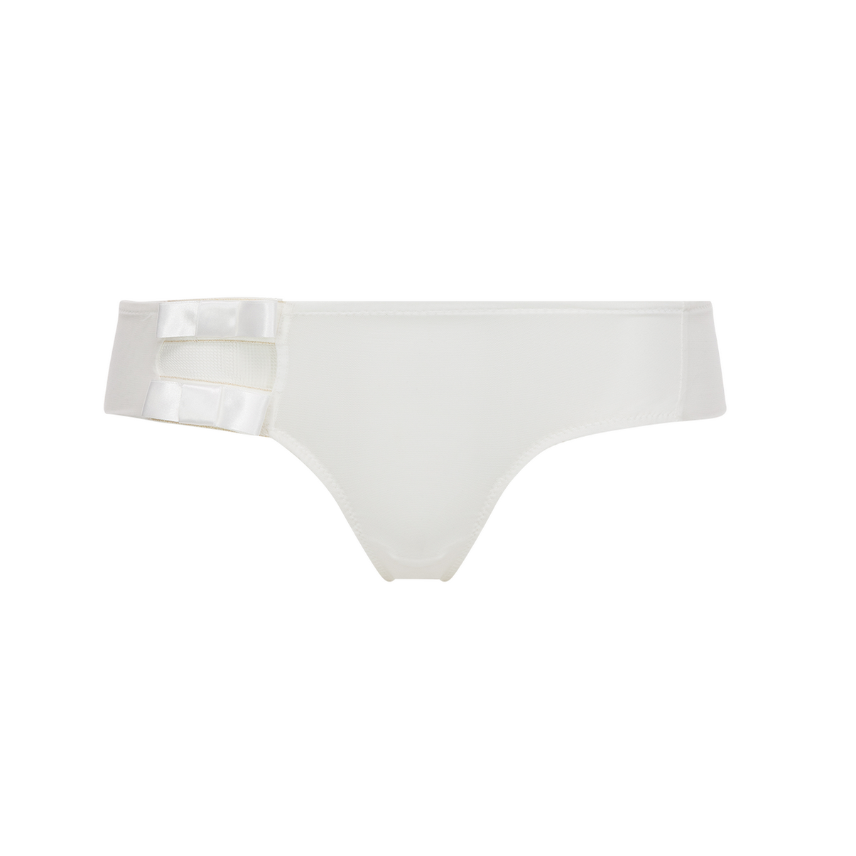 Трусики в форме боксеры-стринги с широким бедром со среднезаниженной посадкой выполнены из прозрачнго тюля. На передней панели справа вставка из сетчатой ткани с двумя атласными бантиками, а задняя панель с присобранным швом посредине - из двойного тюля, подвернутого снизу, что делает край абсолютно невидимым под одеждой и очень комфортным.