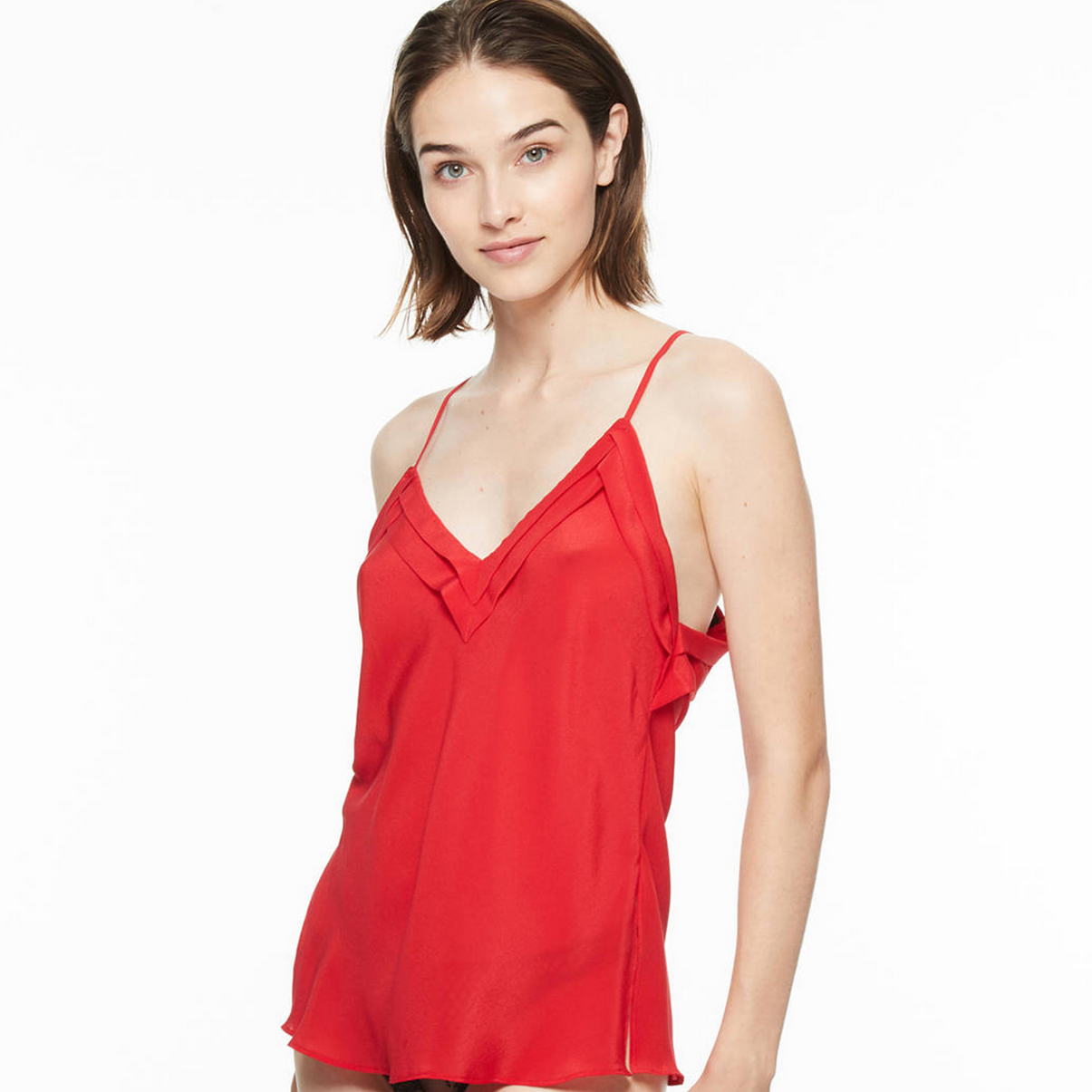 Топ на тонких бретелях выполнен из 100% шелка. V - образная форма декольте декорирована элементами оригами. Оригинальная спинка, регулирующиеся бретели.