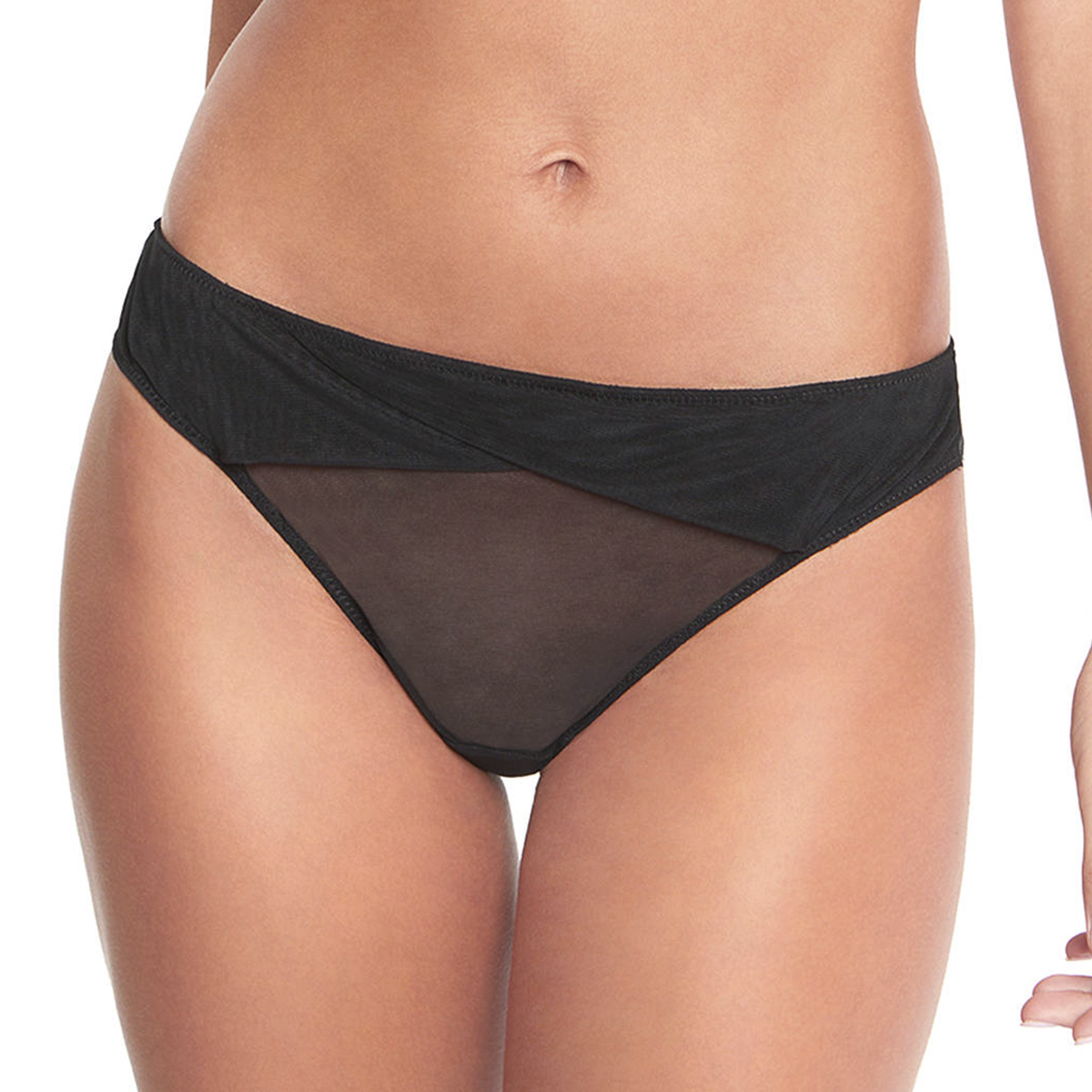 Трусы - стринги со средне-заниженной посадкой. Полностью выполнены из эластичного тюля. Задняя панель - бесшовная; дополнена вырезом с бантом.