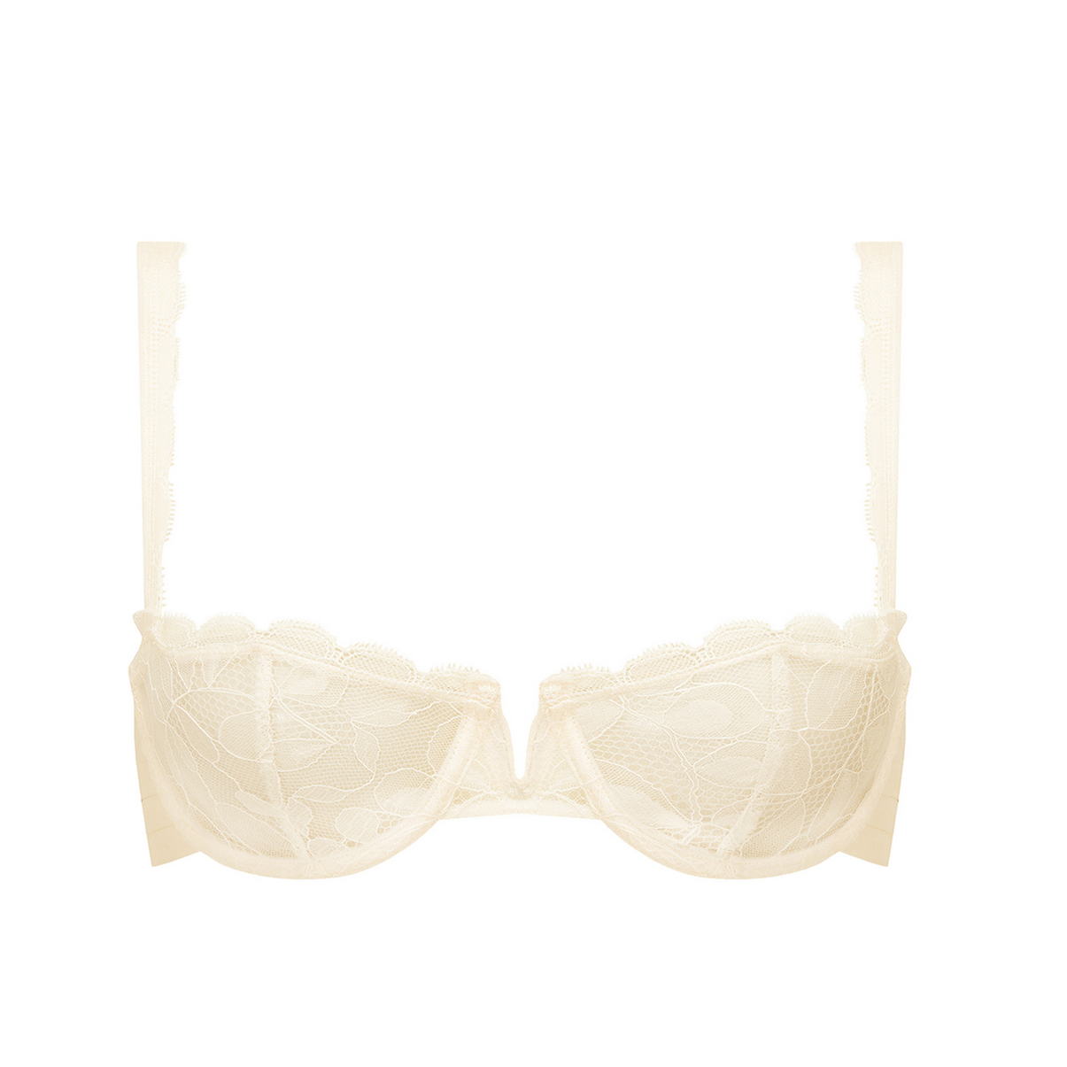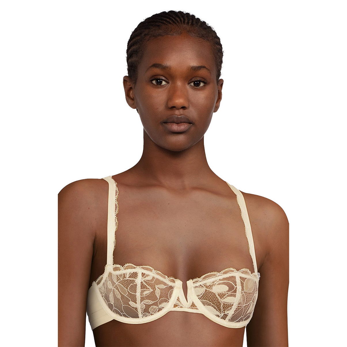 Бюстгальтер - балконет с мягкой открытой формой чашек на косточках. Чашки выполнены из кружева с растительным орнаментом. Область декольте и бретели дополнены декоративными зубчиками. Боковые панели дополнены элементами шнуровки. Регулирующиеся бретели.