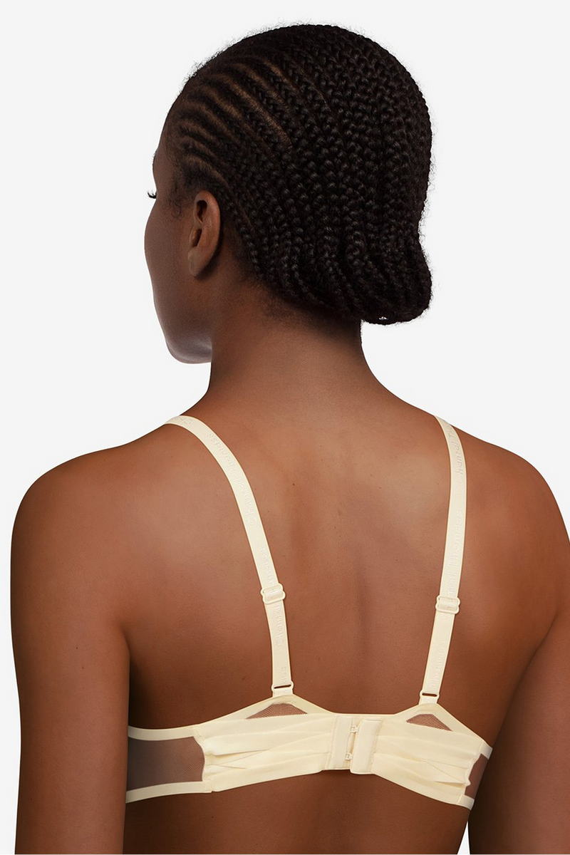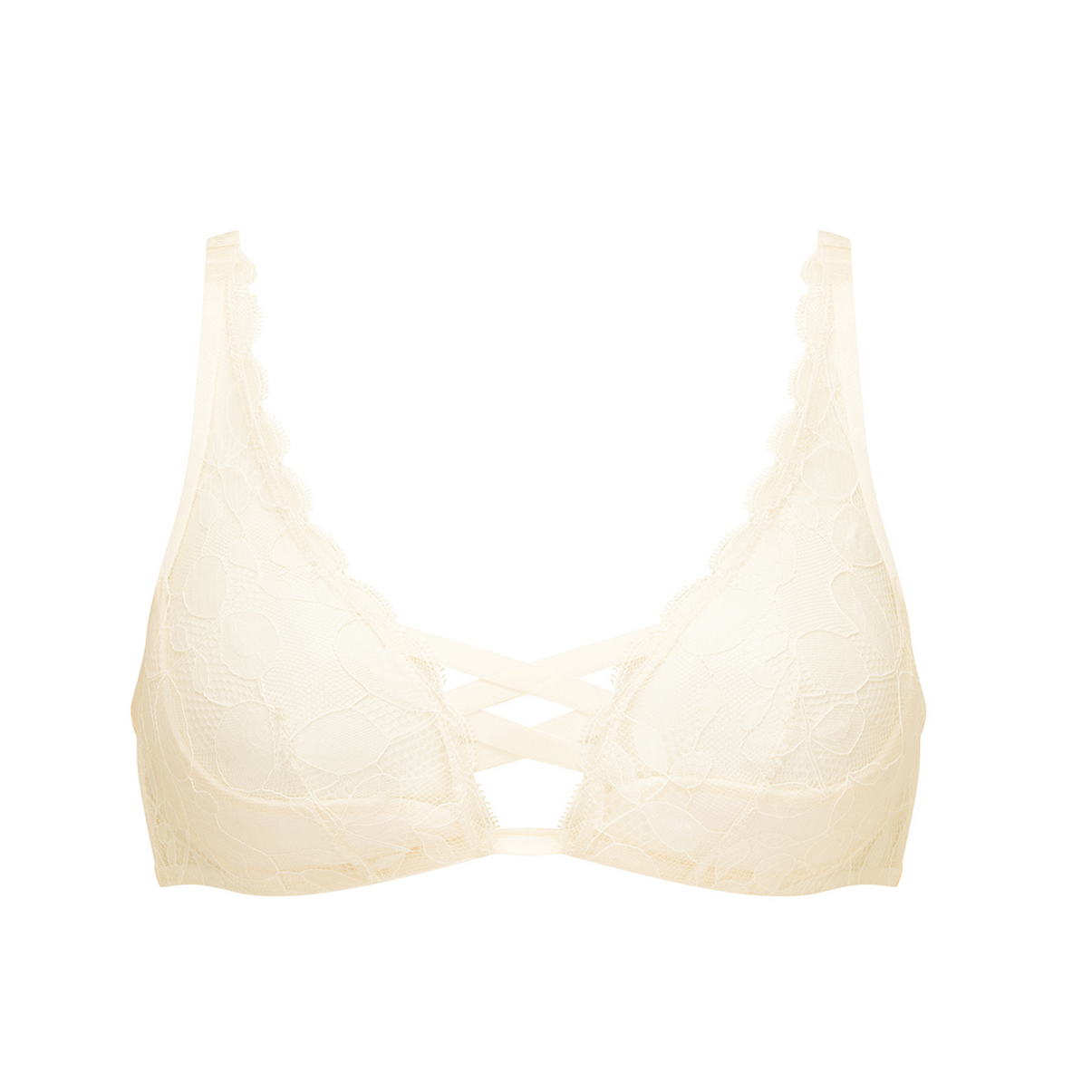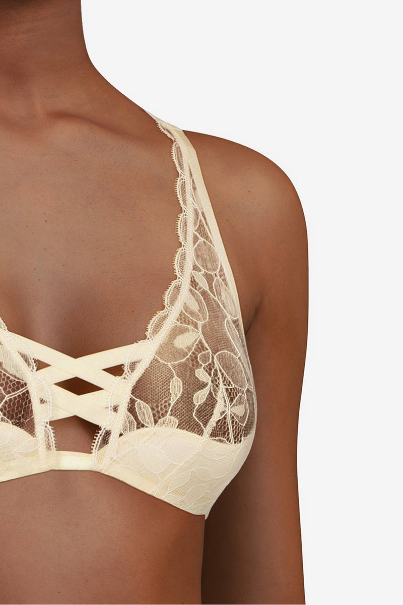 Бюстгальтер с треугольной полу-уплотненной чашкой на косточках. Чашки выполнены из кружева с растительным орнаментом. Область декольте дополнена декоративными зубчиками и шнуровкой. Регулирующиеся бретели.