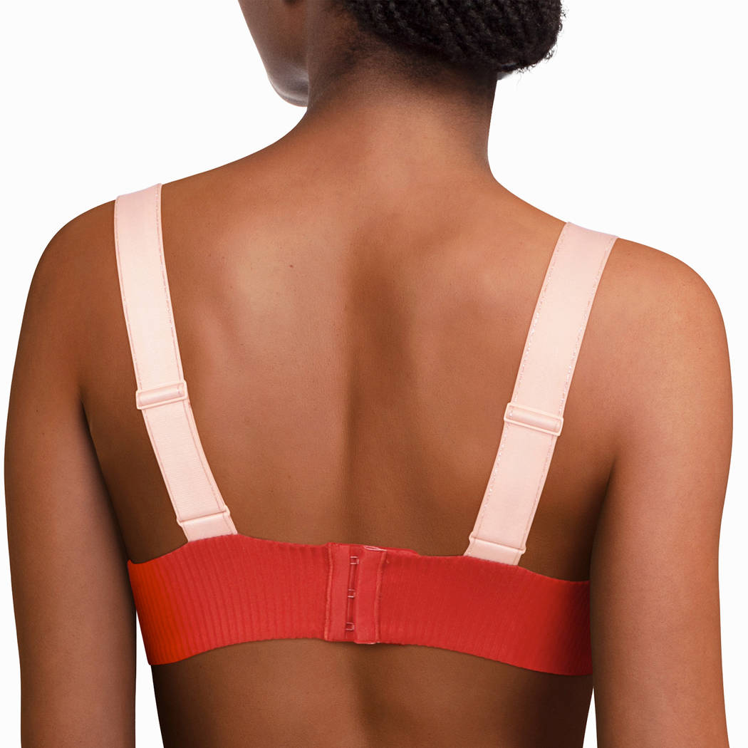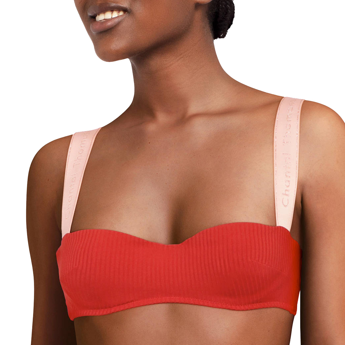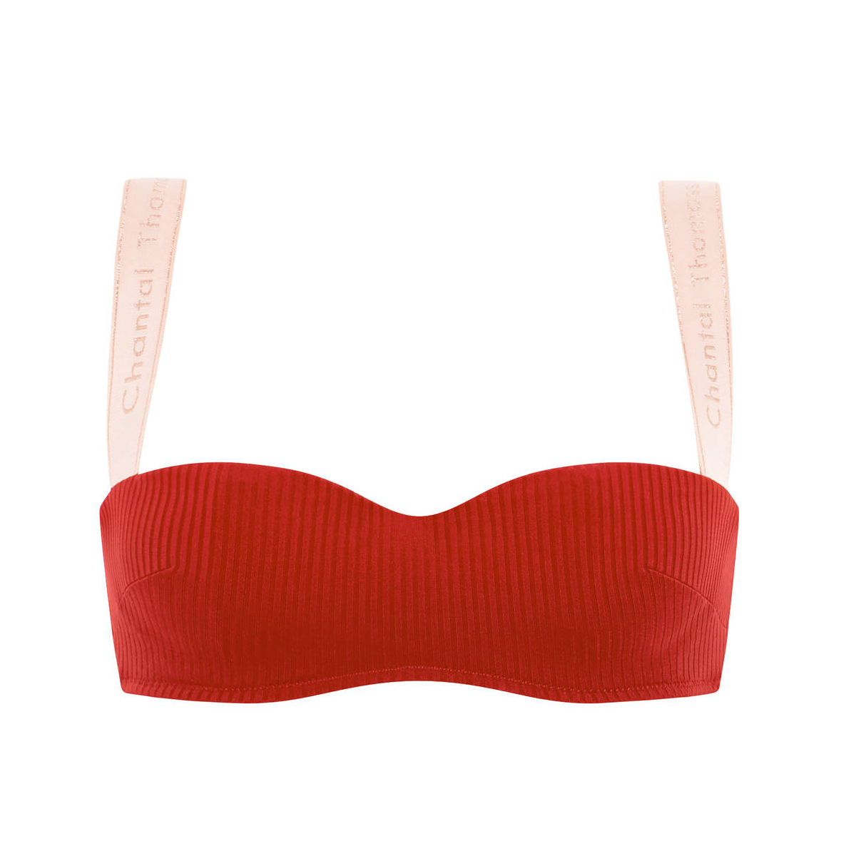 Бюстгальтер - бандо с мягкой открытой формой чашек со скрытыми косточками. Чашки выполнены из ткани в рубчик, с внутренней стороны дублированы. Бретели выполены из эластичной резинки с логотипом Chantal Thomass в спортивном стиле. Бретели регулируются.