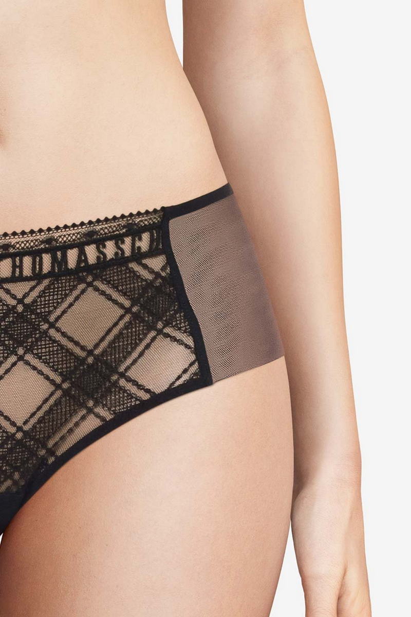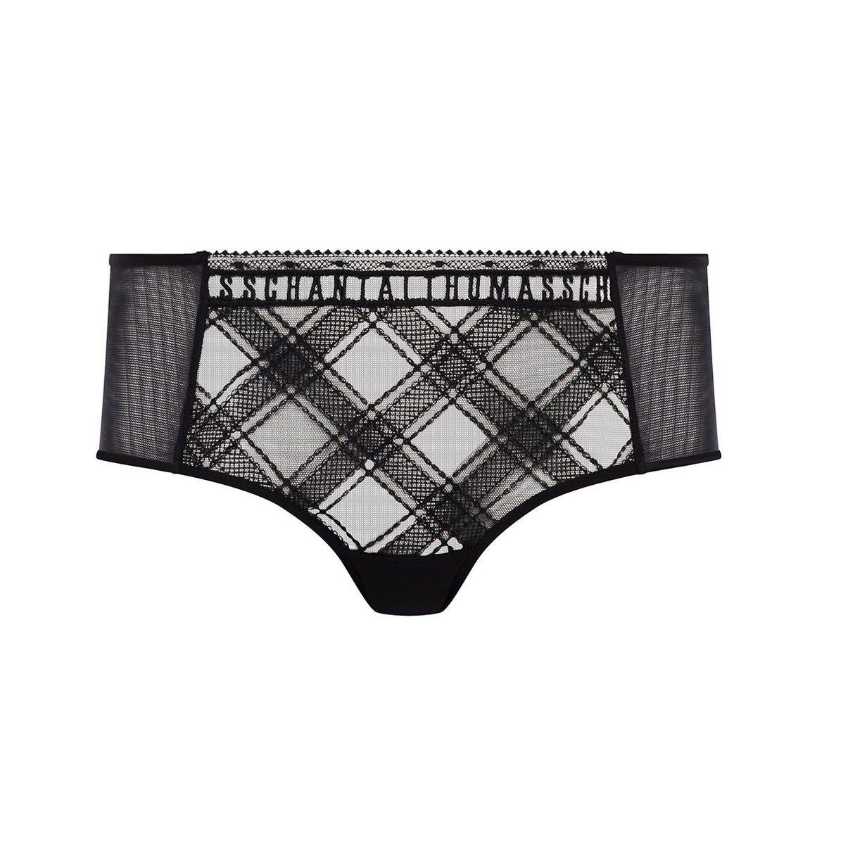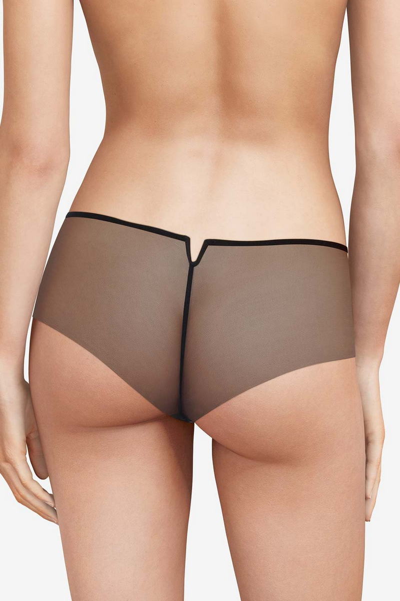 Трусы-боксеры со средне-заниженной посадкой. Передняя панель выполнена из прозрачного тюля, который декорирован вышивкой (либо с цветочным орнаментом, либо узором тартан), также на передней панели разместились инициалы "Chantal Thomass", что ассоциируется с прикосновением руки Мастера. Задняя и боковые панели - из прозрачного тюля с необработанным нижнем краем.