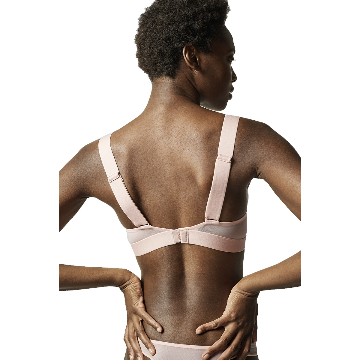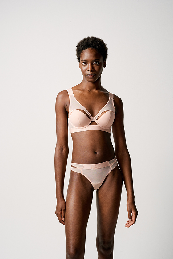 Бюстгальтер формованный со слегка уплотненной формой чашек. Чашки выполнены из тонкого мусса и покрыты тюлем, с соблазнительными вырезами. Основа бюстгальтера и регулирующиеся бретели выполнены в виде эластичных резинок в стиле спорт-шик и дополнены логотипом.