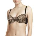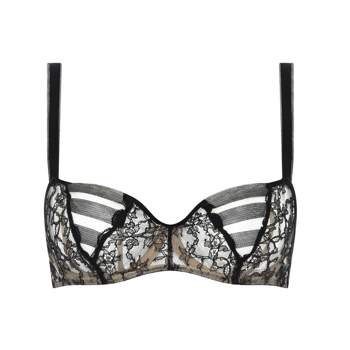 Бюстгальтер - балконет с мягкой достаточно открытой формой чашек на косточках. Чашки выполнены из кружева и декорированы графичными эластичными лентами из тюля; с внутренней стороны дублированы тюлем. Бретели и задняя панель бюстгальтера также декорированы эластичными лентами из тюля. Регулирующиеся бретели с логотипом.