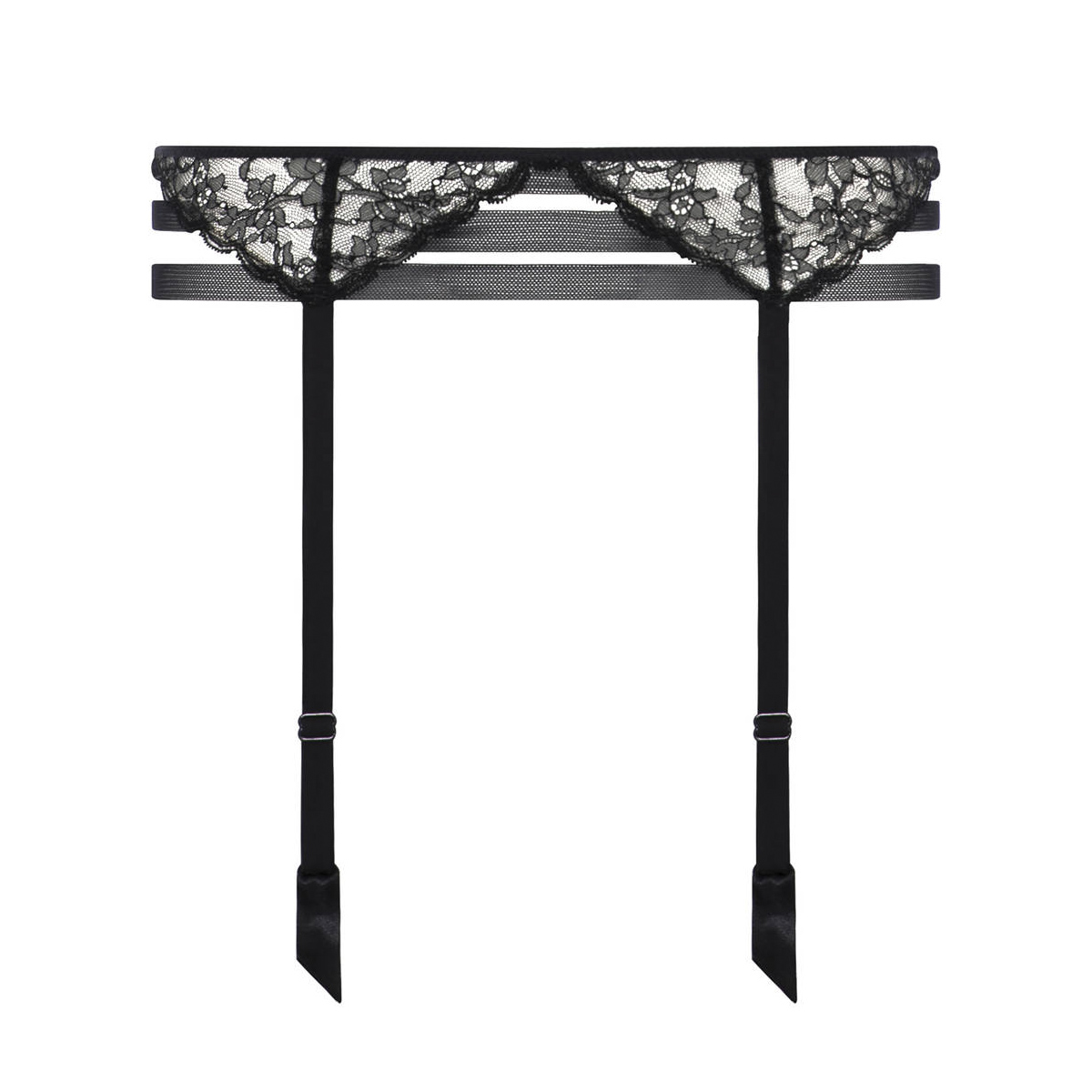 Пояс для чулок с 4-мя регулирующимися подтяжками. Выполнен из кружева (кружево дублировано тюлем с внутренней стороны) и декорирован эластичными лентами из тюля.