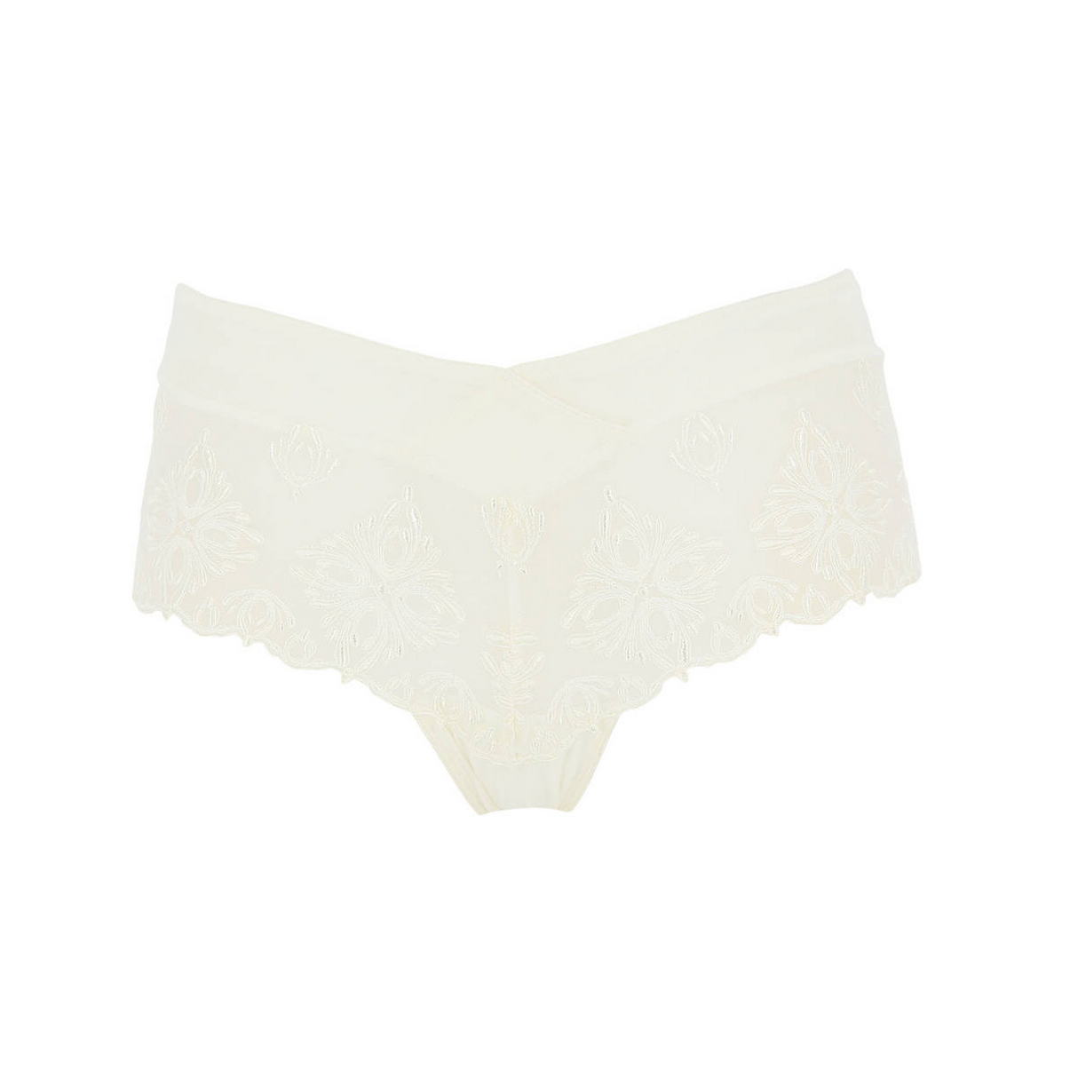 Трусики-боксеры полностью выполненные из тюля с великолепной обьемной многоцветной вышивкой, с V-образной линией талии спереди; без боковых швов; задняя панель закрывает ягодицы до половины; хлопковая ластовица.