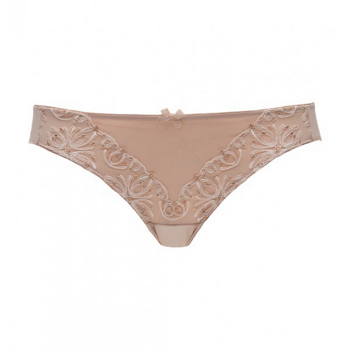 Закрытые трусики с нежным бантиком на талии спереди; передняя панель дублирована и выполнена из тюля с великолепной обьемной многоцветной вышивкой; задняя панель из непрозрачной микрофибры; хлопковая ластовица.
