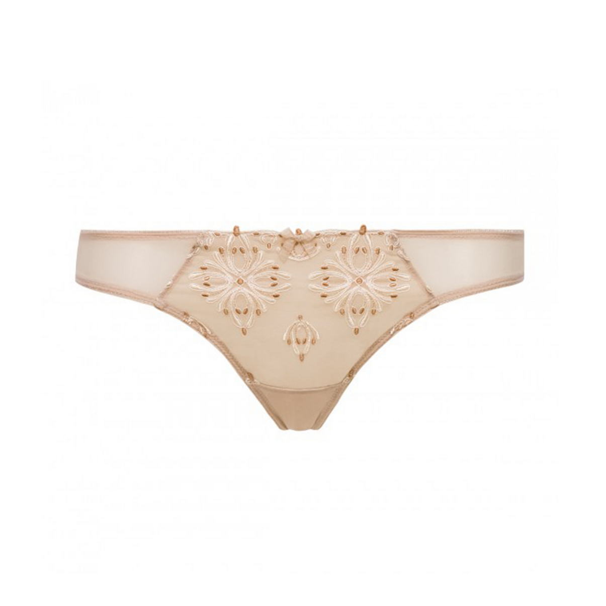 Открытые трусики-стринги из непрозрачной микрофибры; центральная часть передней панели и полностью задняя выполнены из тюля с великолепной обьемной многоцветной вышивкой; без боковых швов; хлопковая ластовица.