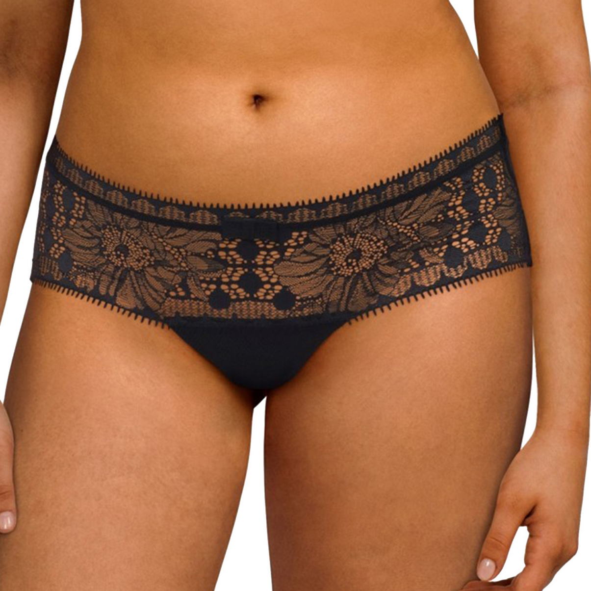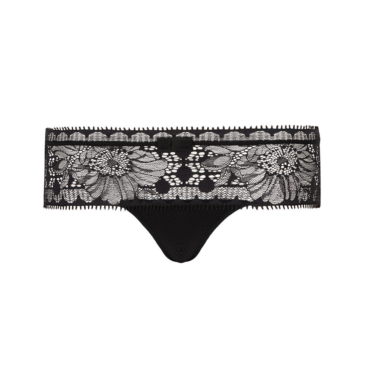 Трусы - боксеры со средней посадкой. Передняя панель, практически полностью, выполнена из кружева с цветочным орнаментом, задняя - из прозрачной сетки.