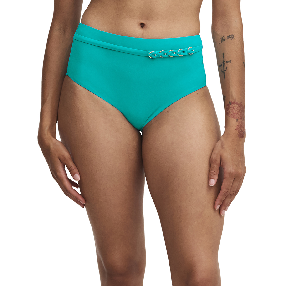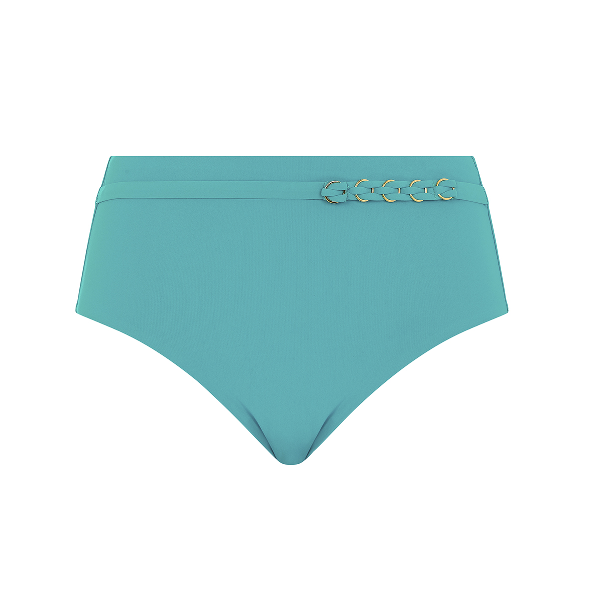 Трусы кюлоты с высокой талией с высокой посадкой. Полностью дублированы для избежания прозрачности. Передняя панель ассиметрично дополнена золотыми кольцами.