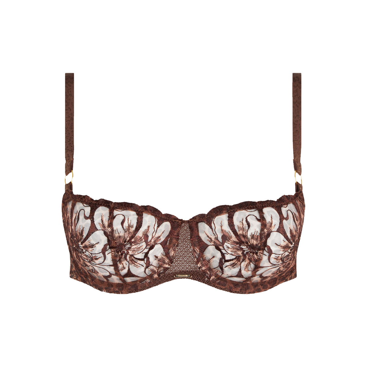 Бюстгальтер - балконет с мягкой открытой формой чашек на косточках. Чашки выполнены из расшитого цветочным орнаментом тюля. Основания регулирующихся бретелей спереди декорированы "золотыми" кольцами. Центральная панель выполнена из сетки и дополнена "золотым" аксессуаром с логотипом бренда.