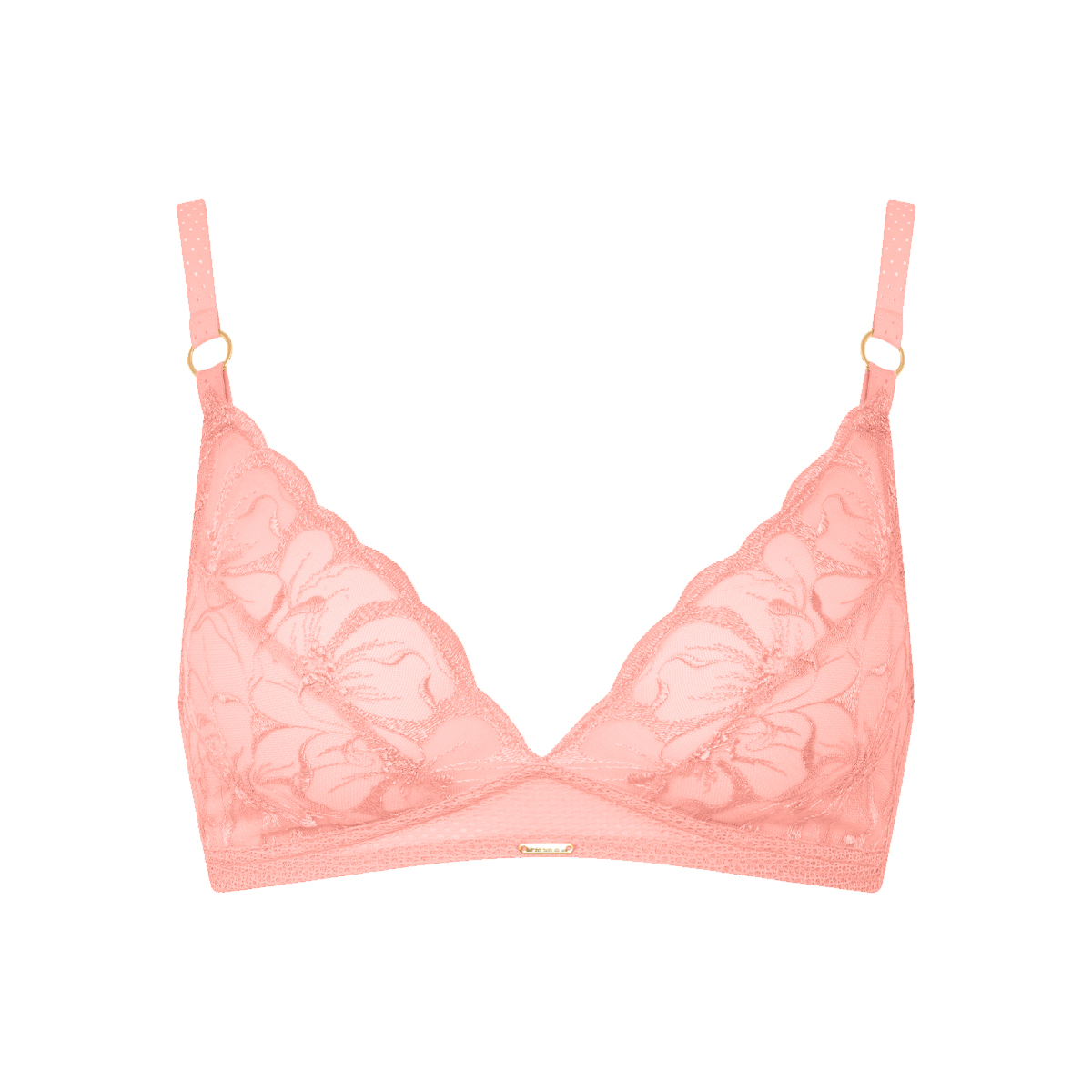 Бюстгальтер с мягкой треугольной формой чашек, без косточек. Чашки выполнены из расшитого цветочным орнаментом тюля и дублированы для придания необходимой поддержки. Основания регулирующихся бретелей спереди декорированы "золотыми" кольцами. Центральная панель выполнена из сетки и дополнена "золотым" аксессуаром с логотипом бренда. Задние панели - из ажурной сетки.