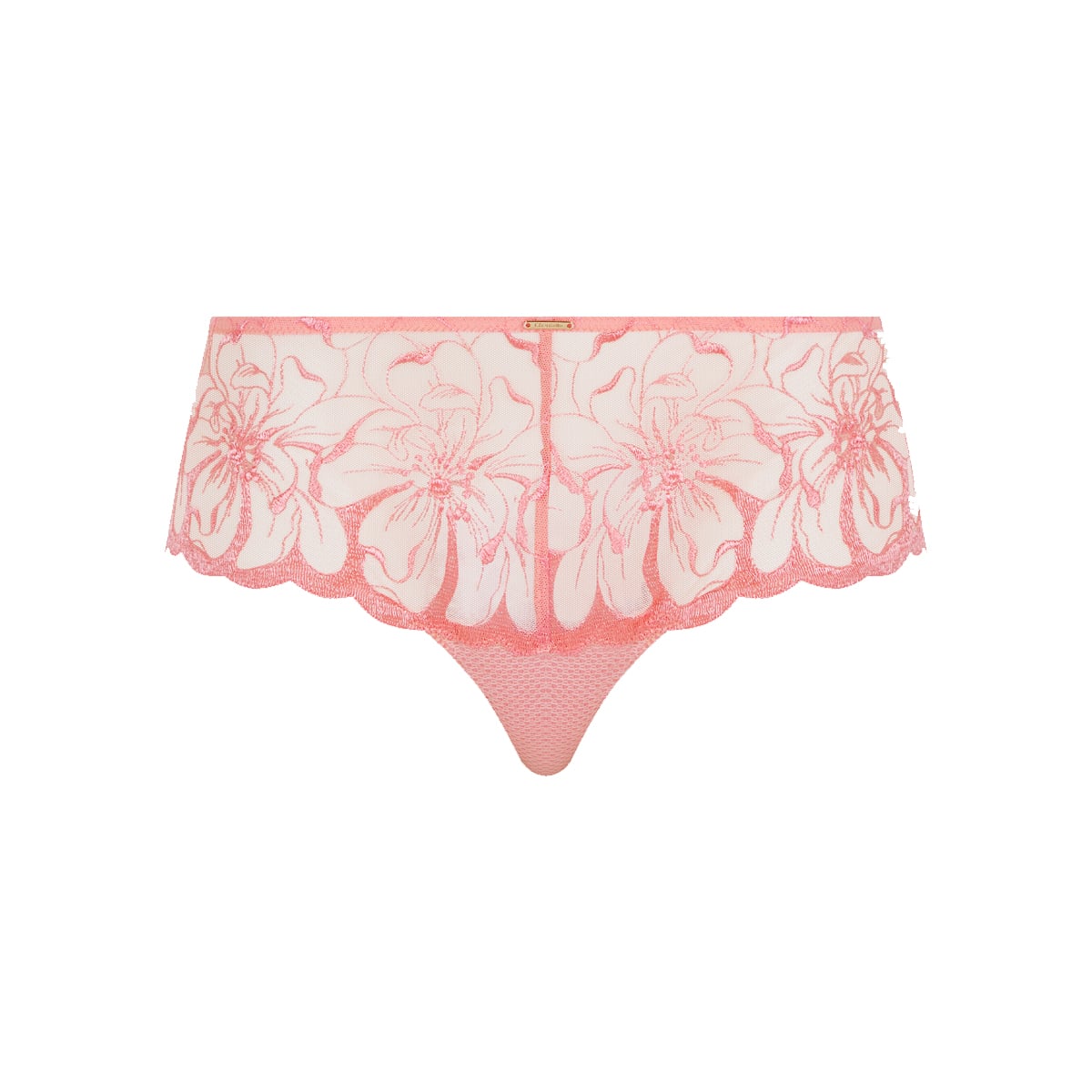 Трусы - боксеры со средне-заниженной посадкой. Полностью выполнены из расшитого цветочным орнаментом тюля. Передняя панель дополнена "золотым" аксессуаром с логотипом бренда