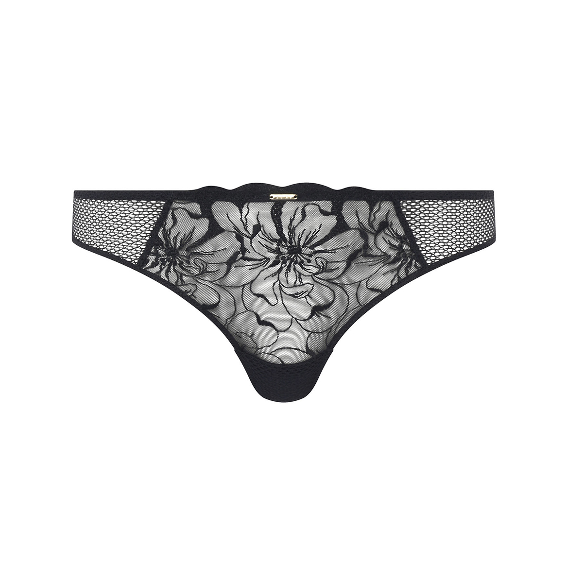 Трусы - стринги со средне-заниженной посадкой. Практически полностью, выполнены из расшитого цветочным орнаментом тюля. Боковые панели - из сетки. Передняя панель дополнена "золотым" аксессуаром с логотипом бренда.