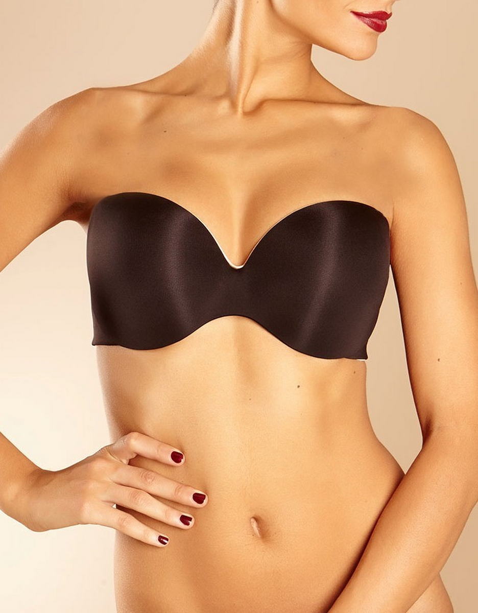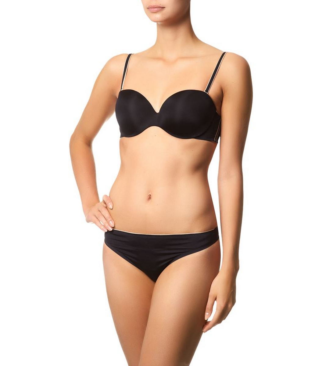 Гладкий балконет с интегрированной подушкой для приподнимающего эффекта; невидимый под одеждой; чашки покрыты абсолютно гладкой тканью, слегка с отливом; отстегивающаяся бретель; в бретельках - специальный наполнитель для передавливания; несколько вариантов перестегивания бретелек; застежка с крючками снабжена дополнительной подушкой для большего комфорта; боковины бюстгальтера выполнены потайными швами для эффекта невидимости под одеждой и снабжены силиконовой лентой по краю для фиксации при носке без бретелек; по всем краям изделия - контрастная отделка; на боковине дополнительный шов, с одной стороны с логотипом.