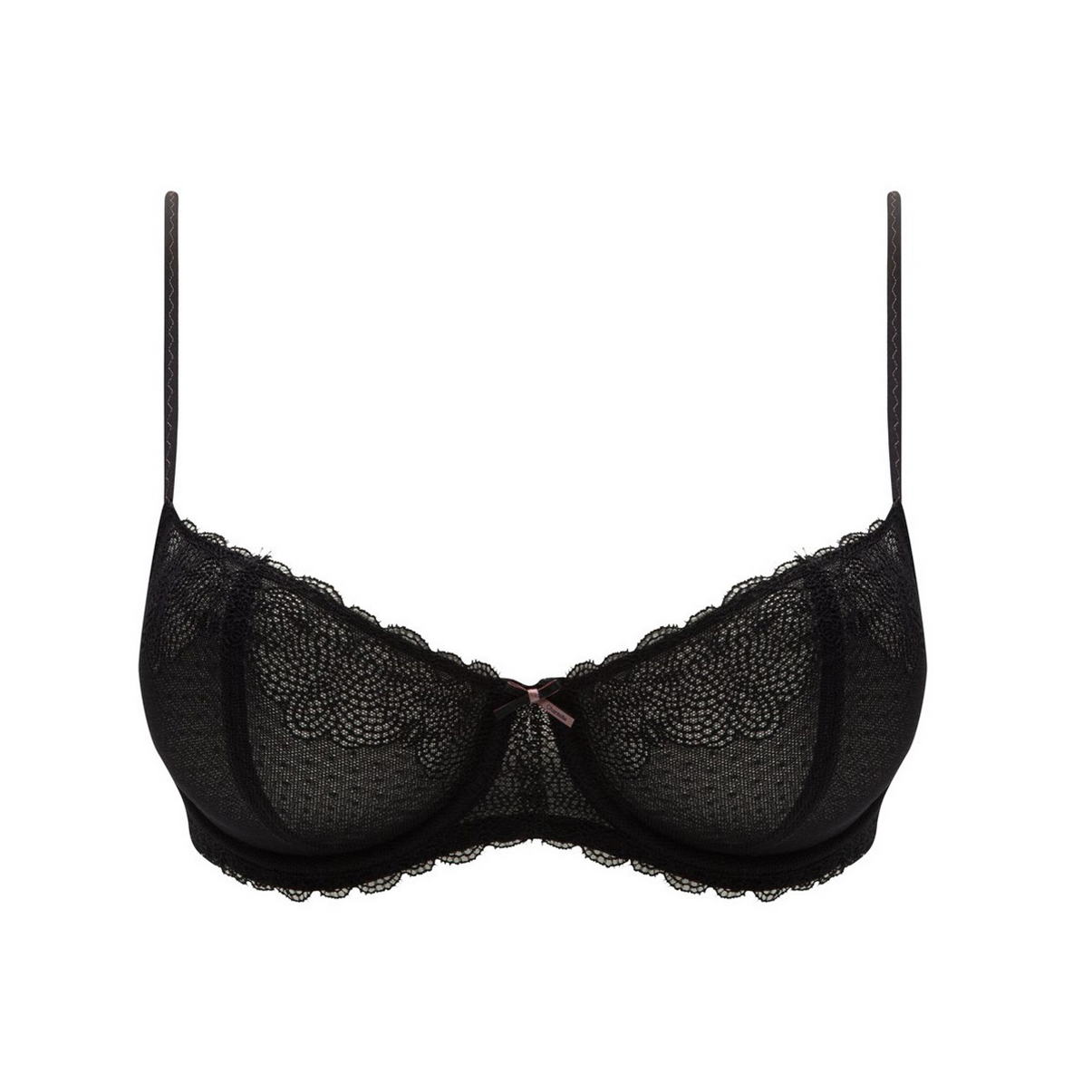 Бюстгальтер - балконет с мягкой открытой формой чашек на косточках. Чашки выполнены из тюля в горошек, с внутренней стороны дублированы для придания необходимой поддержки, по-верхнему краю декорированы кружевом. Основа и боковые панели бюстгальтера выполнены из плоского кружева. Центральная панель декорирована бантиком. Регулирующиеся бретели.