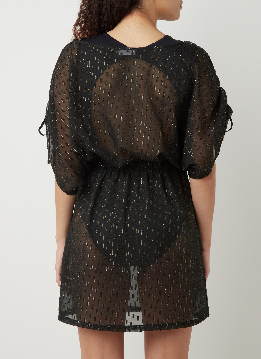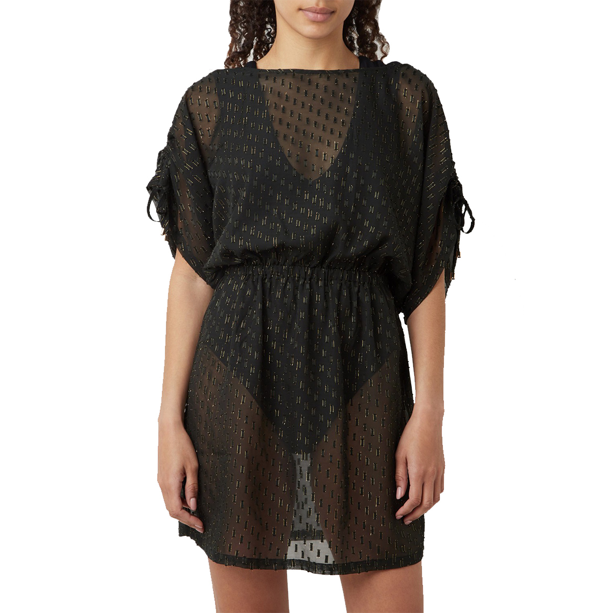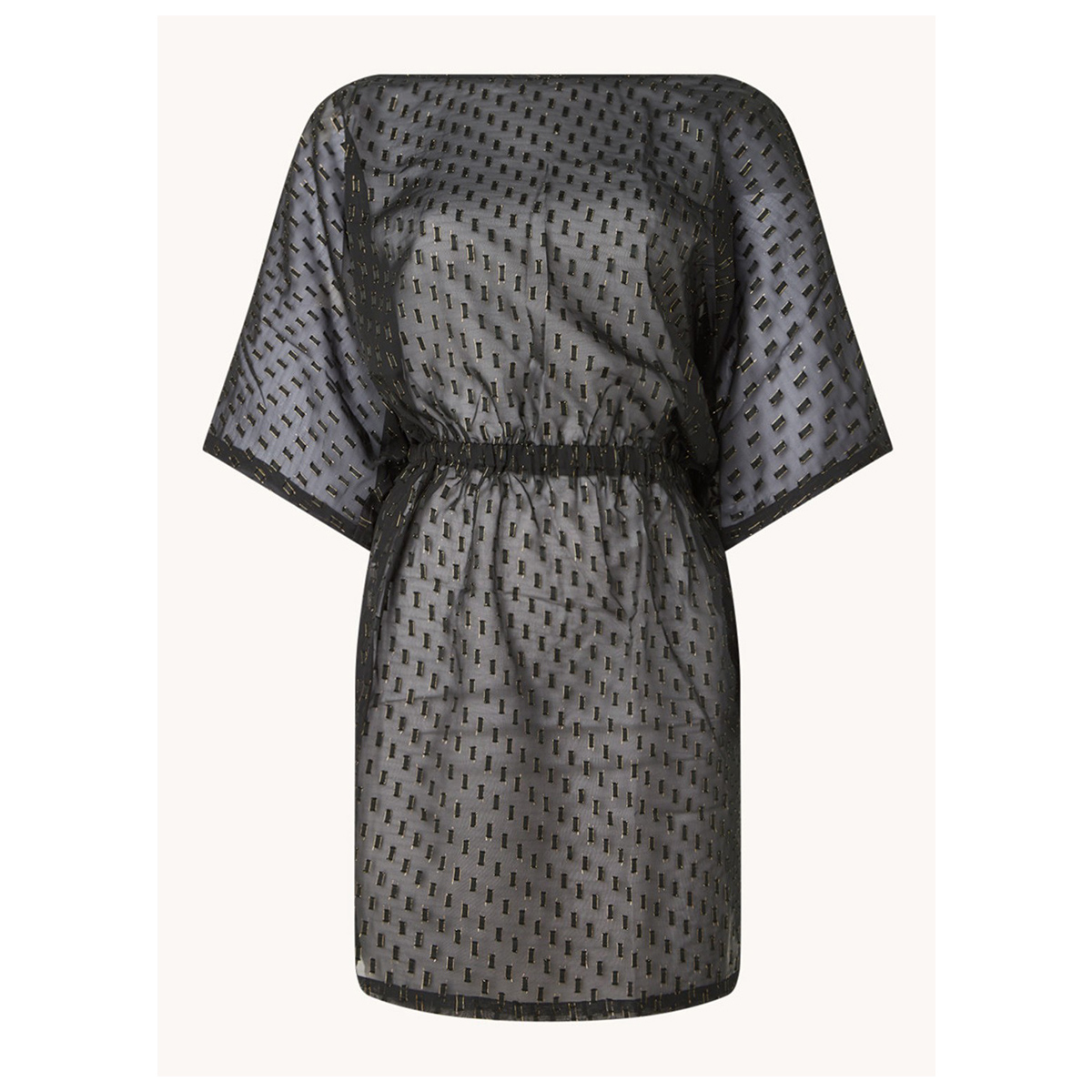 Прозрачная туника свободного кроя с вкраплениями люрекса. Талия на резинке.