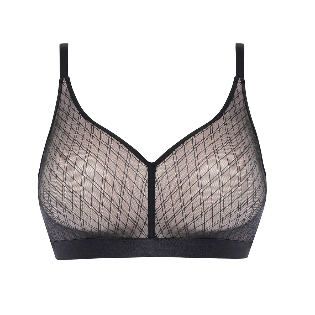 Бюстгальтер-бралет с мягкой бесшовной треугольной формой чашек без косточек. Чашки выполнены из тюля с графичным орнаментом; с внутренней стороны дублированы - для придания необходимой поддержки и избежания прозрачности. Боковые панели оснащены косточками и выполнены из тюля с графичным орнаментом; с внутренней стороны дублированы - для придания необходимой поддержки. Основа бюстгальтера - широкая эластичная тесьма, которая обеспечивает дополнительную поддержку. Регулирующиеся бретели. Отличная поддержка для большой груди.