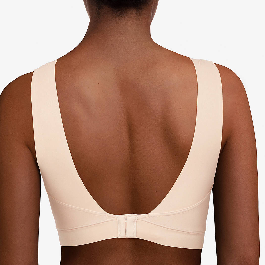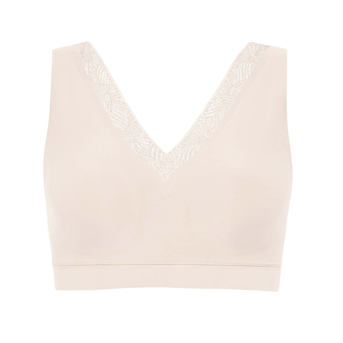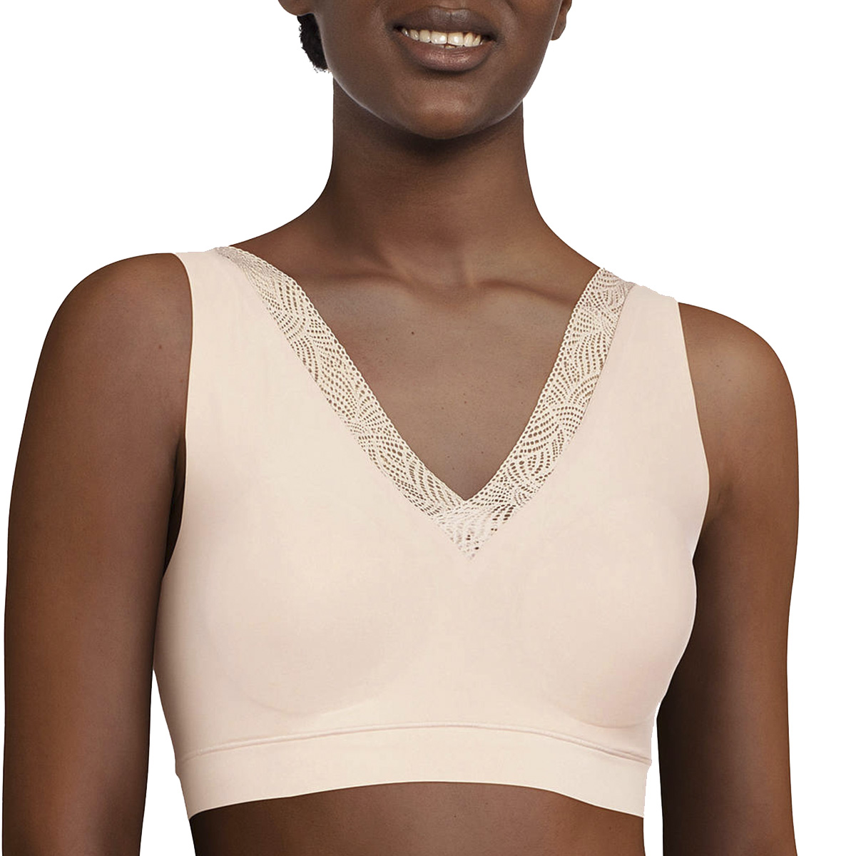 Бесшовный бюстгальтер-топ с глубоким V-образным вырезом декольте, который декорирован ультра плоским кружевом. Без косточек. Выполнен из мягкого и эластичного материала, который обладает эффектом "второй кожи". Бюстгальтер оснащен интегрированными подушками. Комфорт и поддержка Вам гарантированы, несмотря, на отсутсвие косточек. Застежка на крючках на задней панели. Спинка также с глубоким V-образным вырезом. Эта модель бюстгальтера разработана специально для того, чтобы следовать за движениями Вашего тела, но при этом оставаясь на месте на протяжении дня.