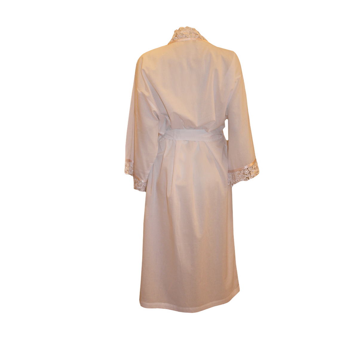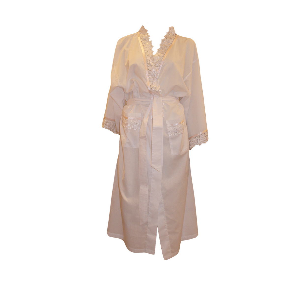 Очень красивый лёгкий халатик-кимоно с изысканным дизайном. Халат длинный, на запах, имеет съемный пояс и накладные карманы. Воротник-кимоно, края рукавов и карманы украшены красивым кружевным декором. Свободный крой не сковывает движения.