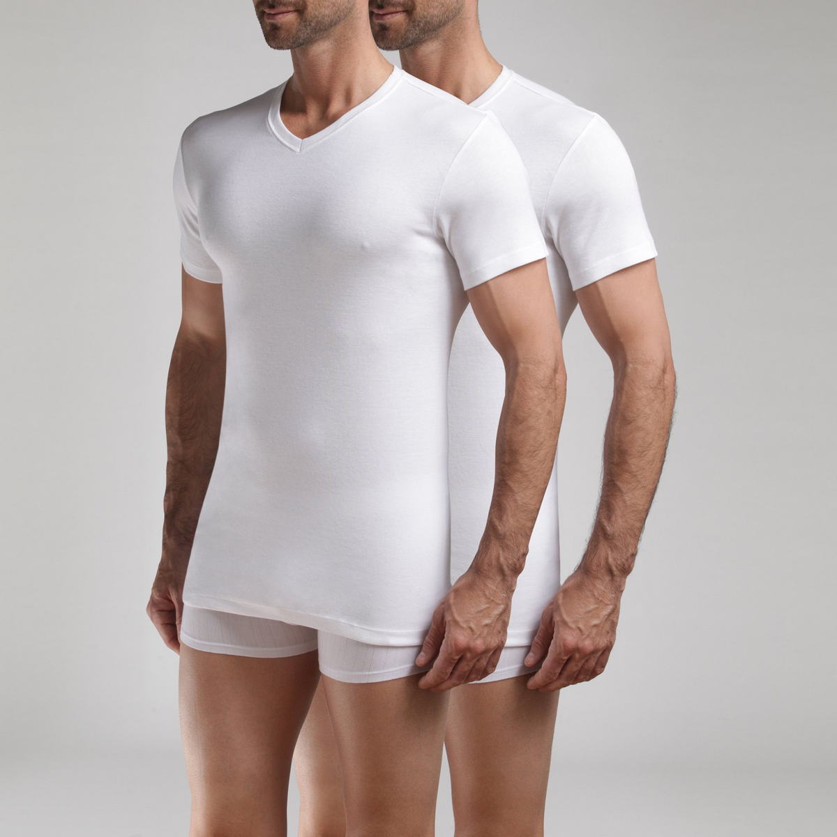 Белые футболки из мягкого хлопка с V-образной горловиной. Без боковых швов.