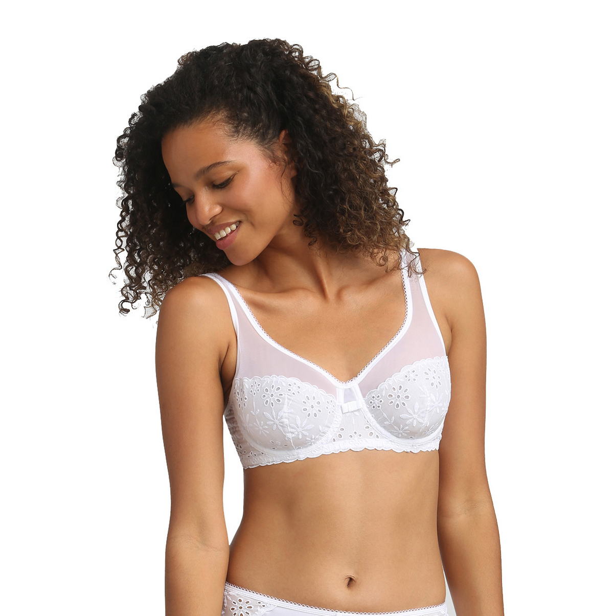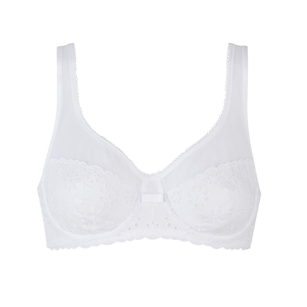Классический бюстгальтер с мягкой закрытой формой чашек на косточках с цельнокройными бретелями. "Балетная" (округлая) спинка уменьшает нагрузку на позвоночник. Регулирующиеся бретели. Область декольте дополнена декоративными зубчиками.